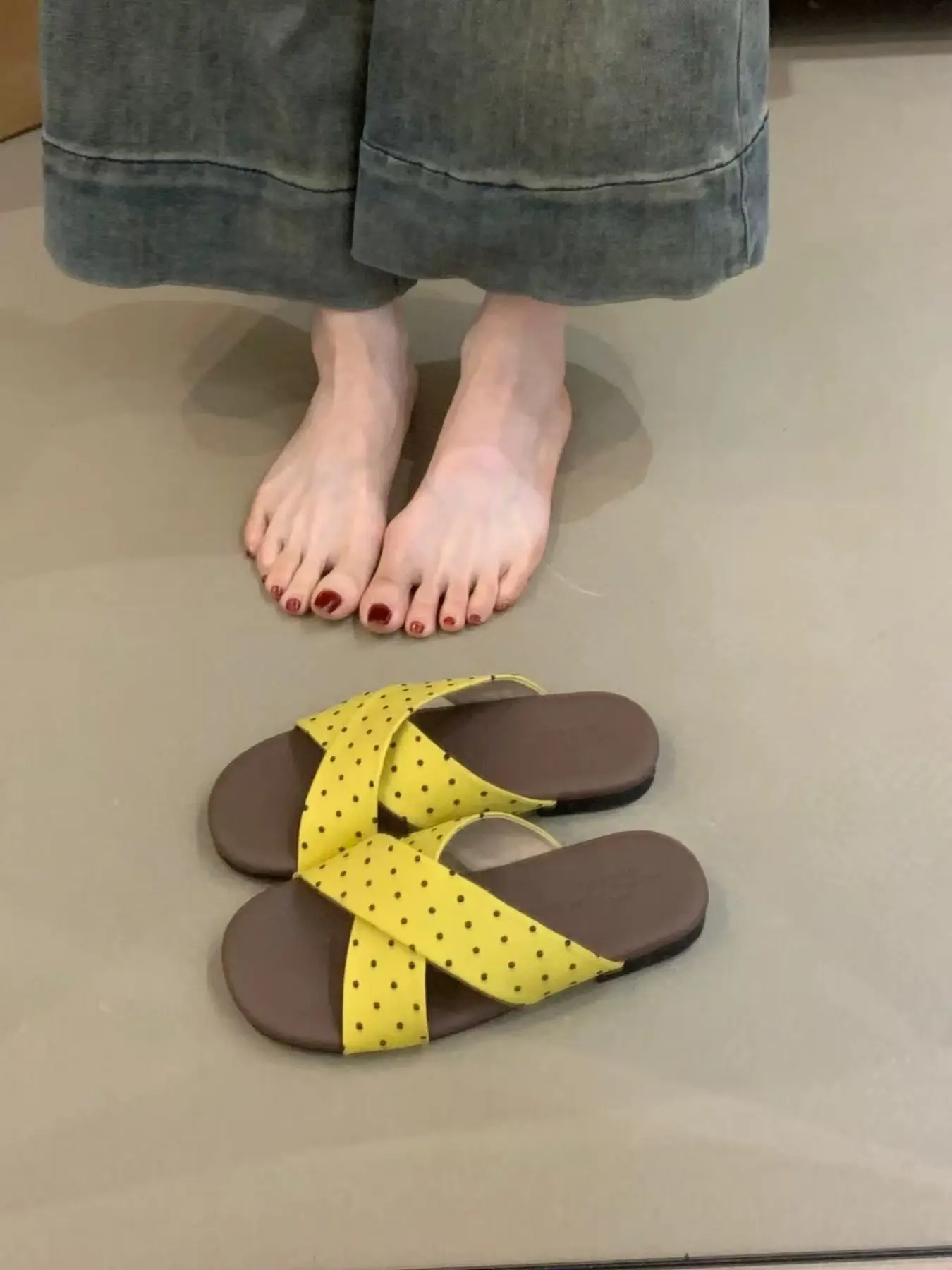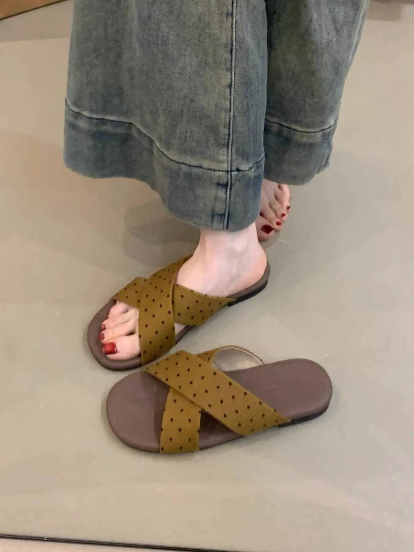 2026 Summer New Polka Dot Cross Strap Sandals for Women, Outdoor Flat Shoes, Versatile Cool Slippers, Fashionable and Comfortable