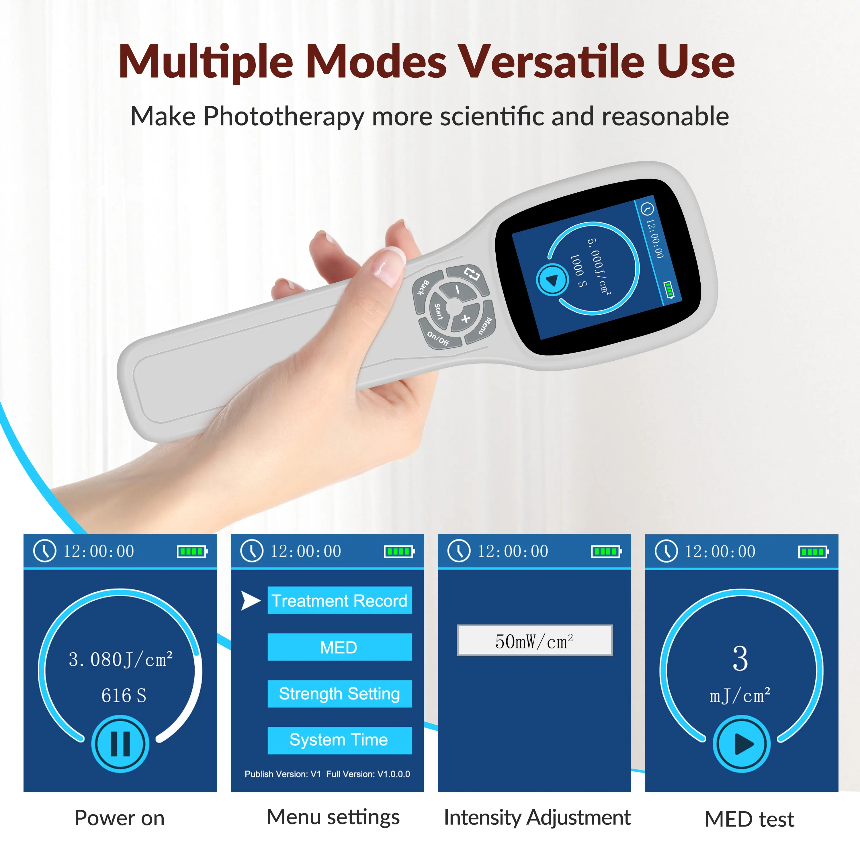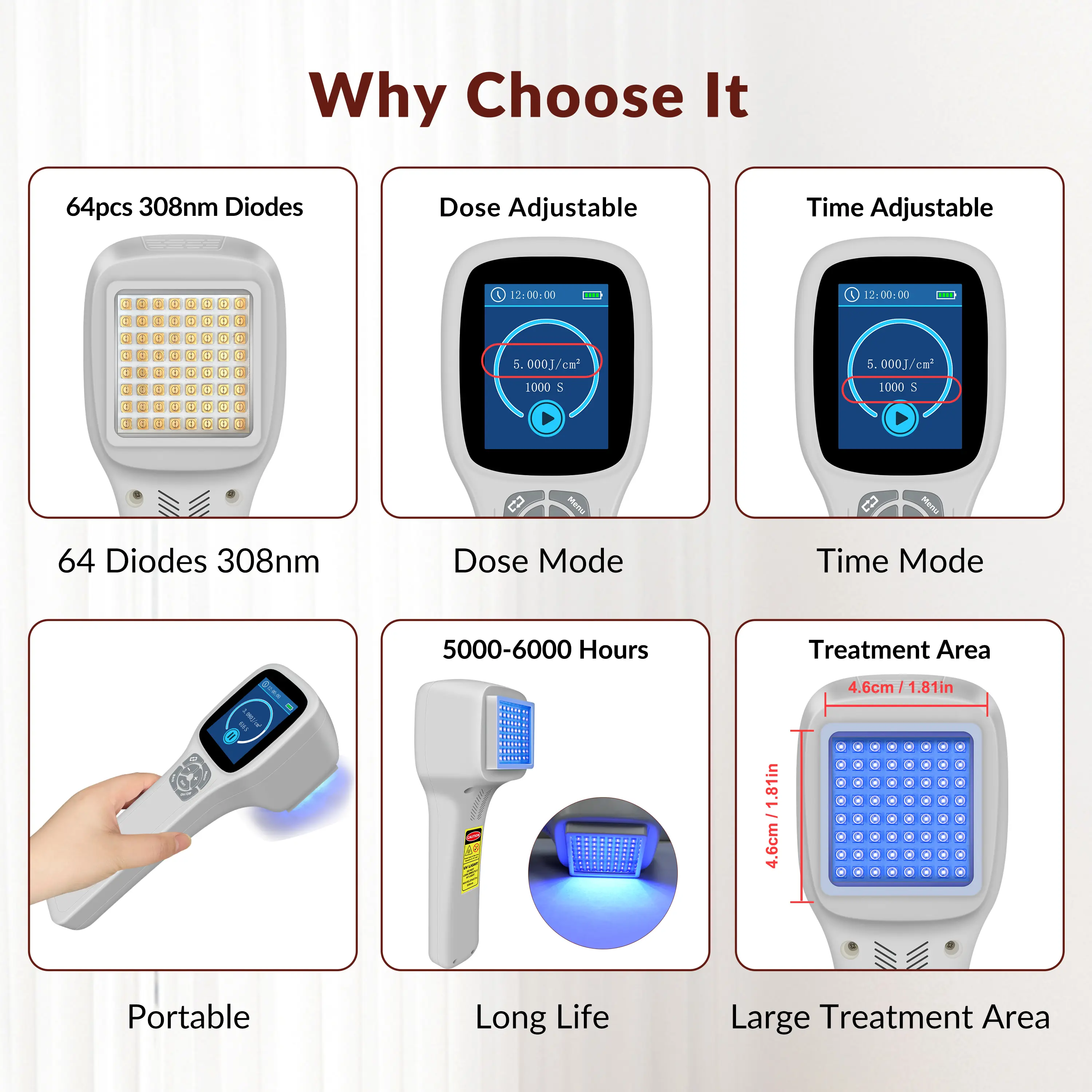 【Multifunction Mode】Uvb light therapy medical devices is 46x46mm±10% irradiation area. 5 different size food grade silicone baffle for accurate target. Dose mode and time mode selected by user according to their requirement. PDT blue light therapy dose setting range 0-5J/cm2, adjustable; Intensity 5-50mW/cm2, adjustable. Recommended usage is 2–3 times per week, with each session lasting 10–180 seconds per treatment area, depending on individual skin tolerance and professional guidance.