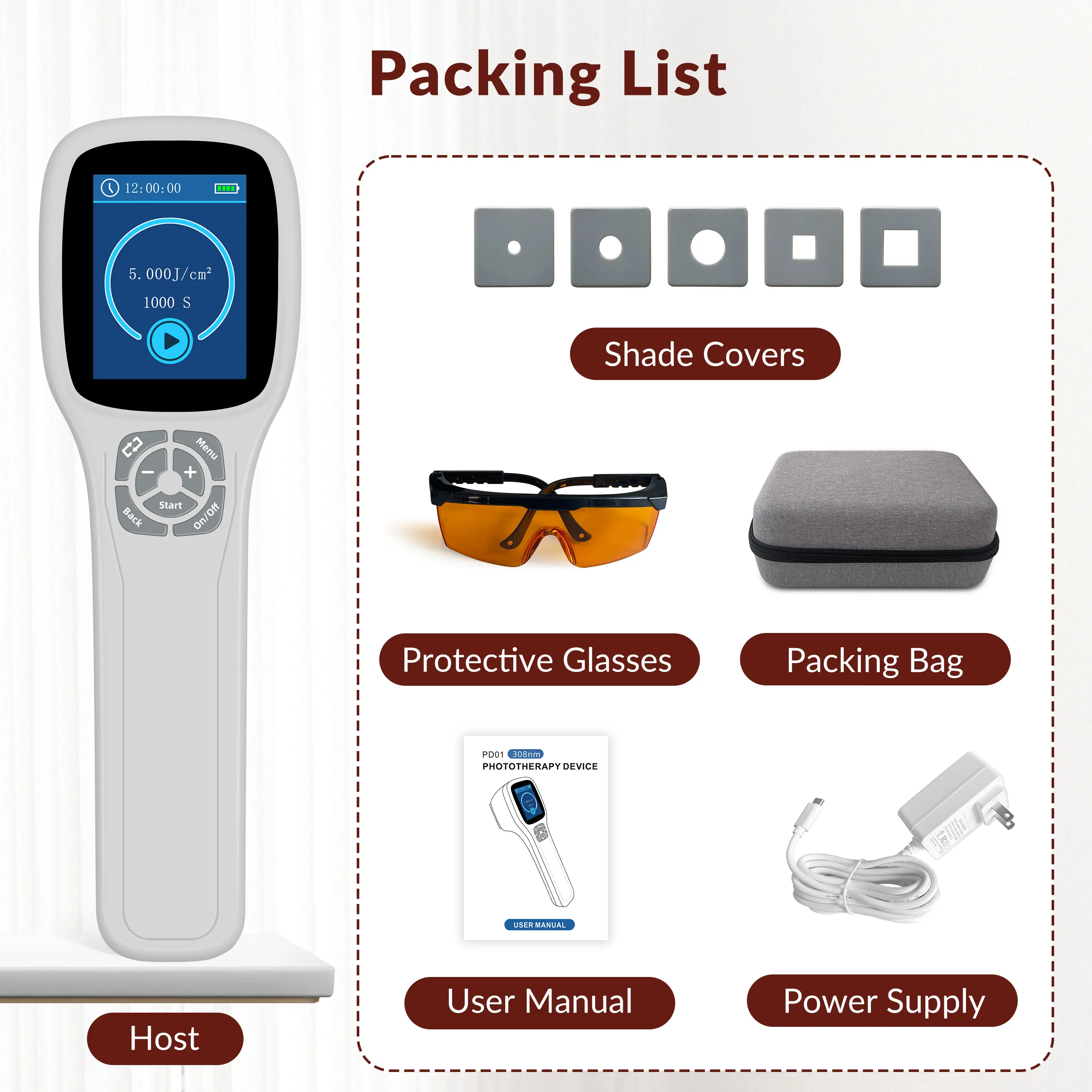 【Package and Service】Phototherapy UVB light include 1x Host,1x Protective Glasses, 5x Shade Covers, 1x Handbag, 1x User Manual, and 1x Power Supply. 3400mAh large capacity lithium battery can support longtime use. If you have any questions with our vitiligo treatment machine, please contact us.we will give you a satisfied solution.