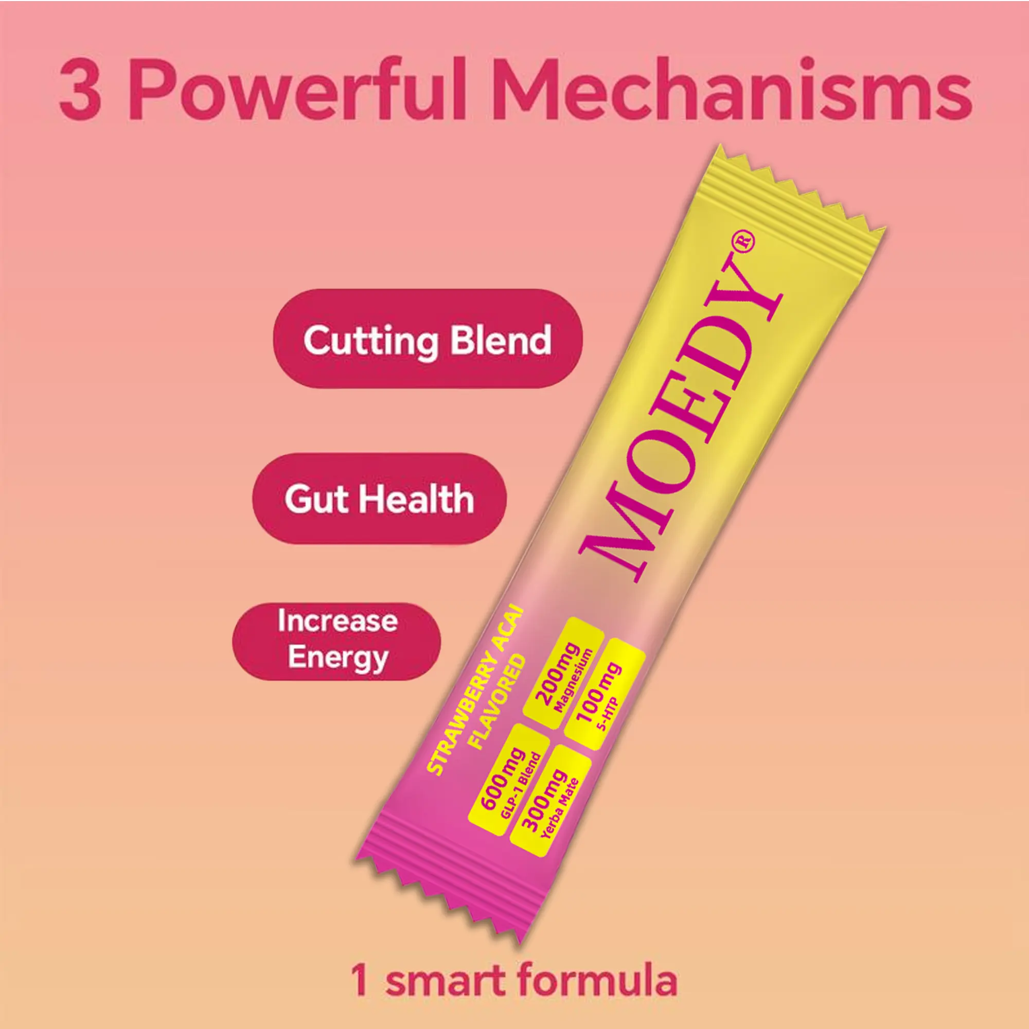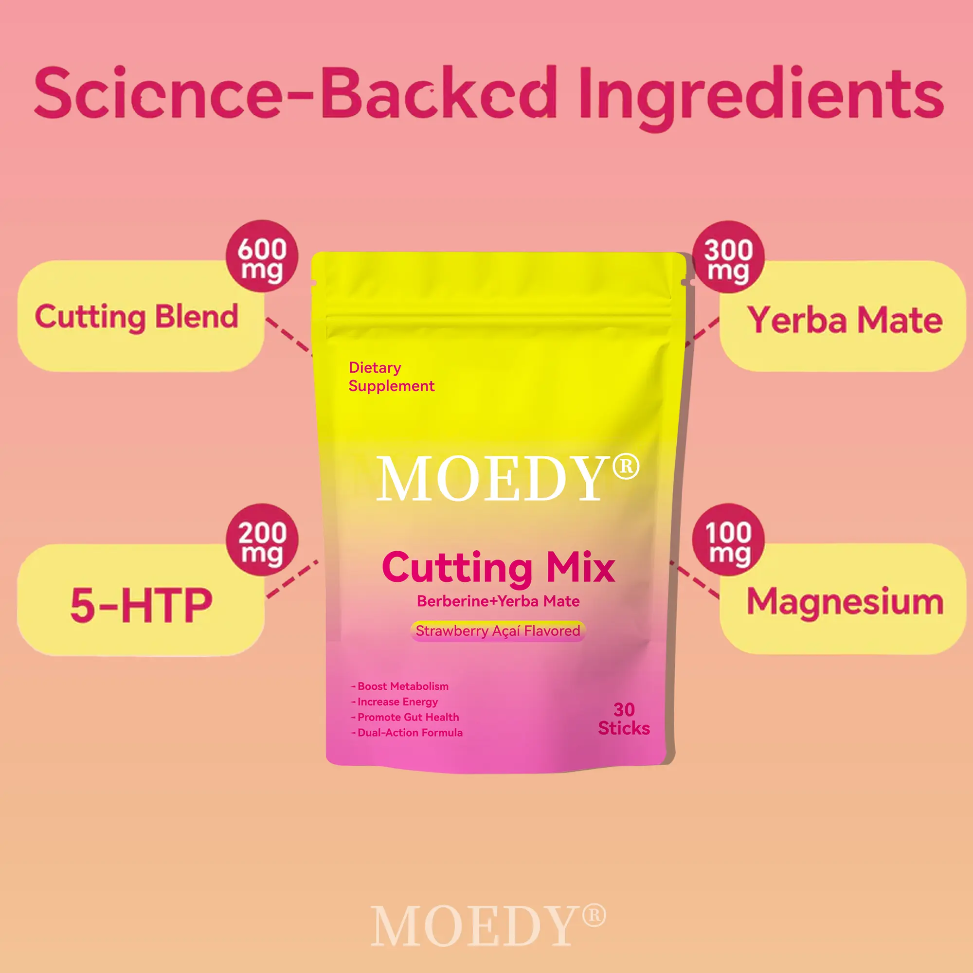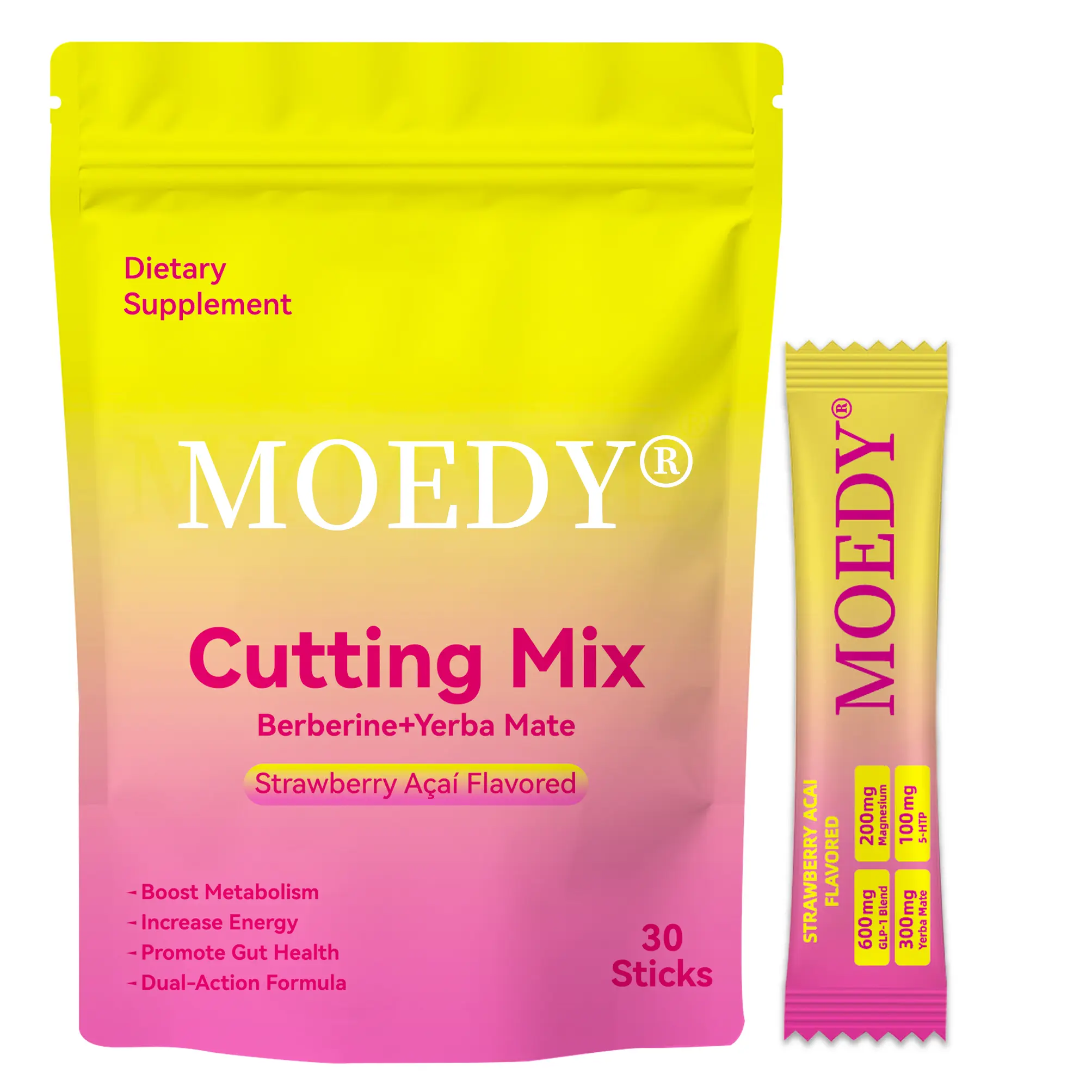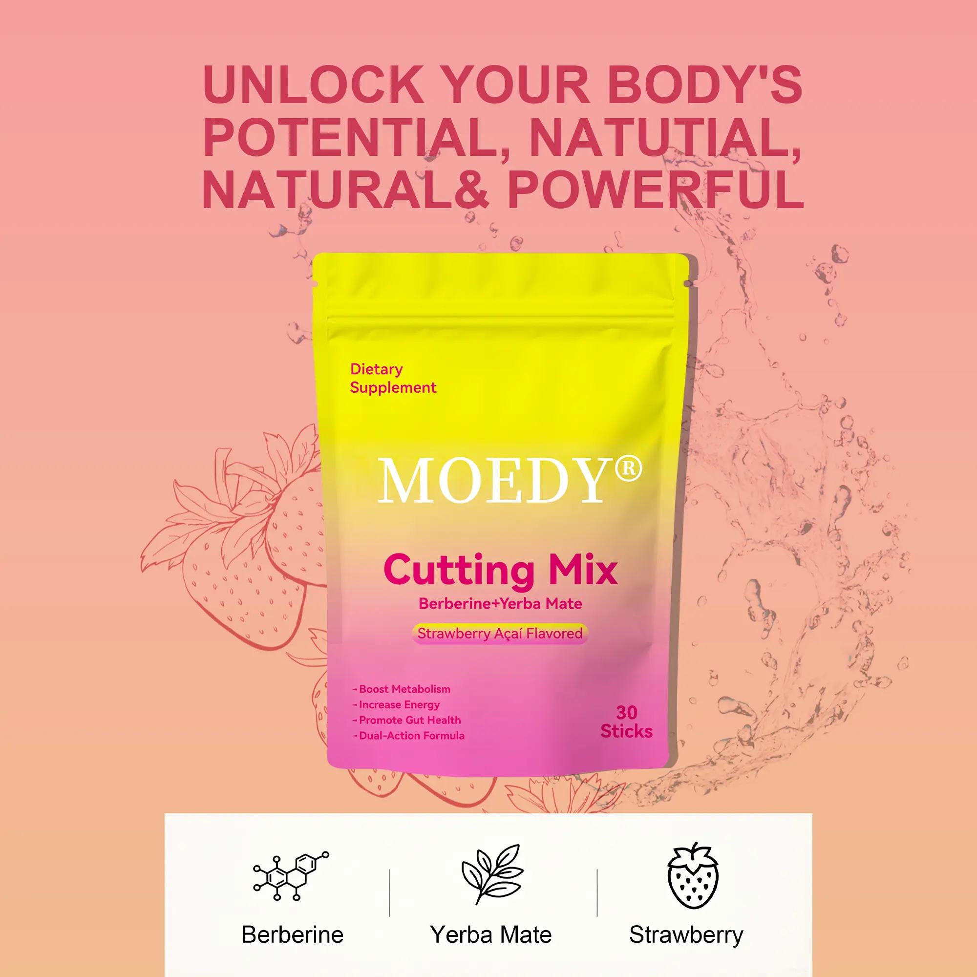 Discover the MOEDY Promote Gut Health Drink Mix, featuring Berberine, Chromium, 5-HTP, Yerba Mate, and Magnesium. This strawberry acai flavor mix offers 30 servings. Perfect for those seeking a blend of natural ingredients to support gut health. Each serving is thoughtfully crafted to provide a unique taste and health benefits.