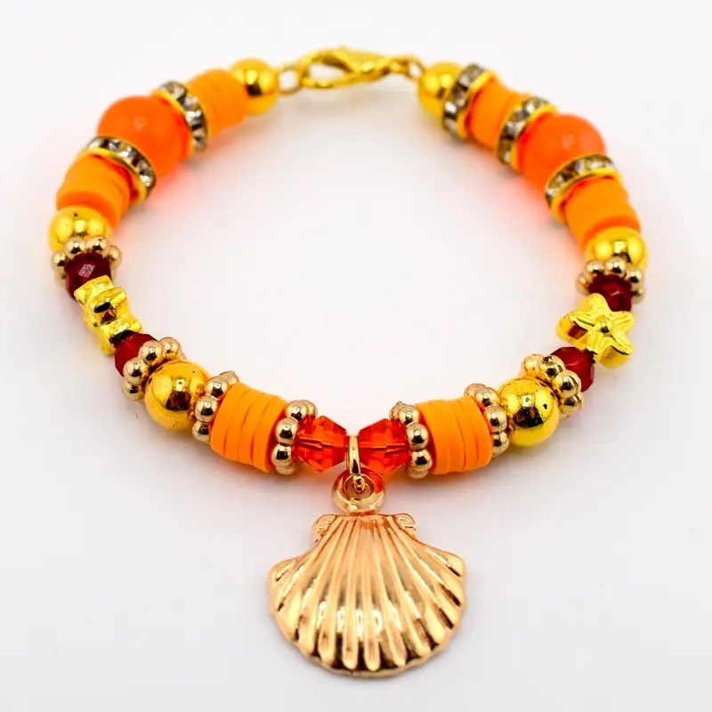 This warm-toned beauty features a curated mix of coral heishi beads, deep red crystal bicones, gold accents, rhinestone rondelles and polished gold beads — all centered around a stunning silver seashell charm pendant. It’s giving mermaid-core meets golden hour, and we are here for it.