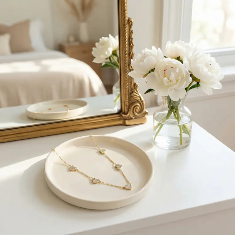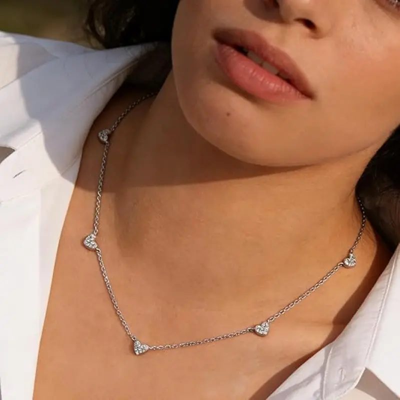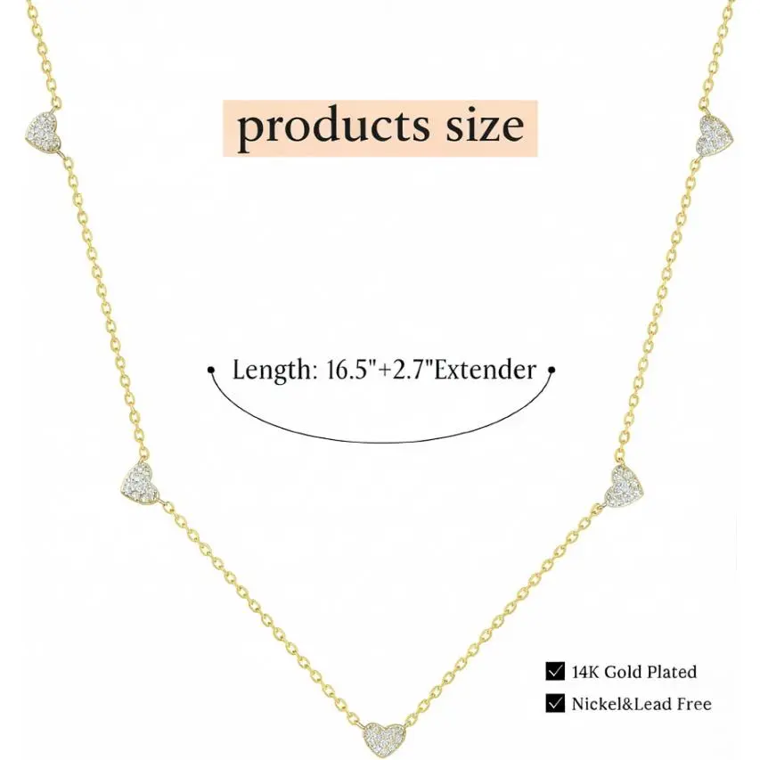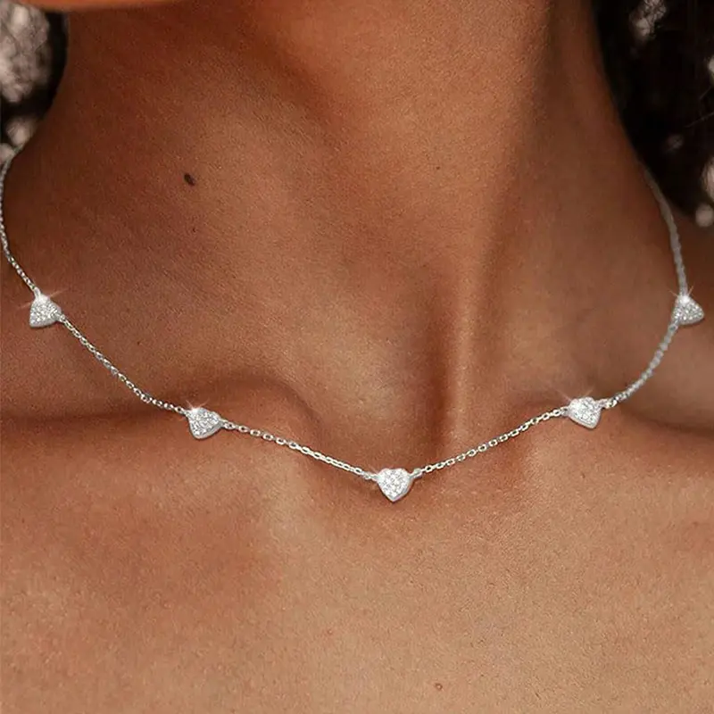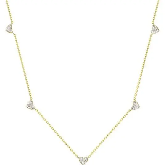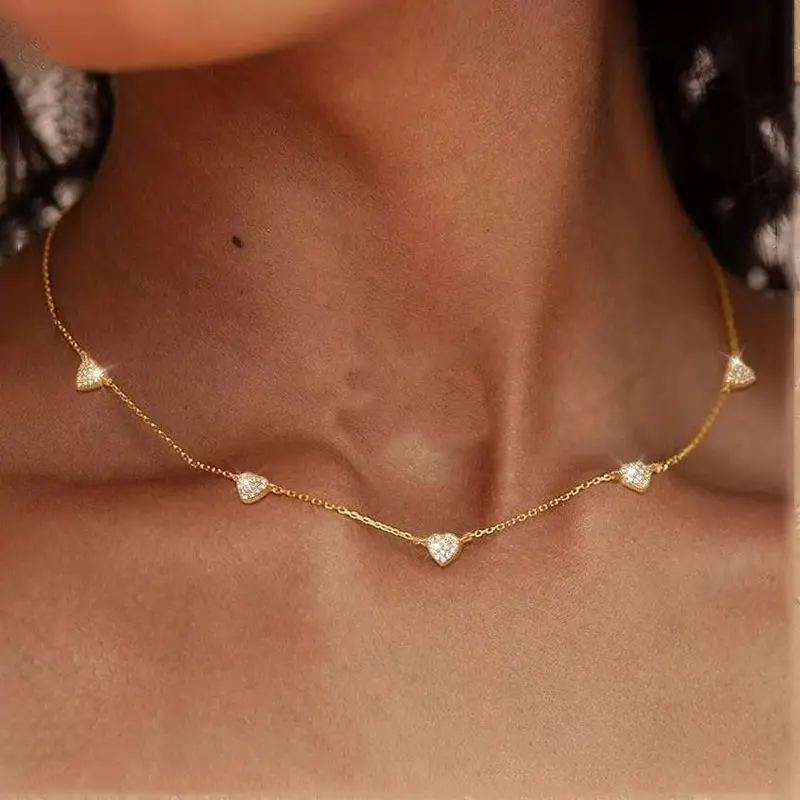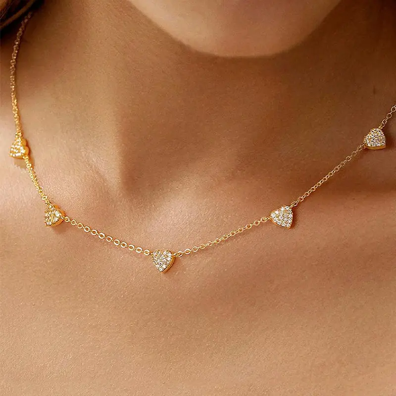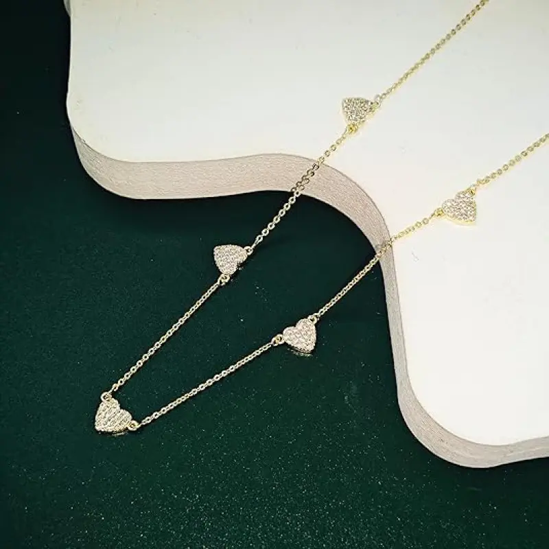 This delicate necklace features sparkling heart-shaped stones set evenly along a slim gold-tone chain, creating a sweet and elegant collarbone look.The tiny heart stations add just the right amount of shine, making the necklace look feminine, refined, and easy to wear every day.