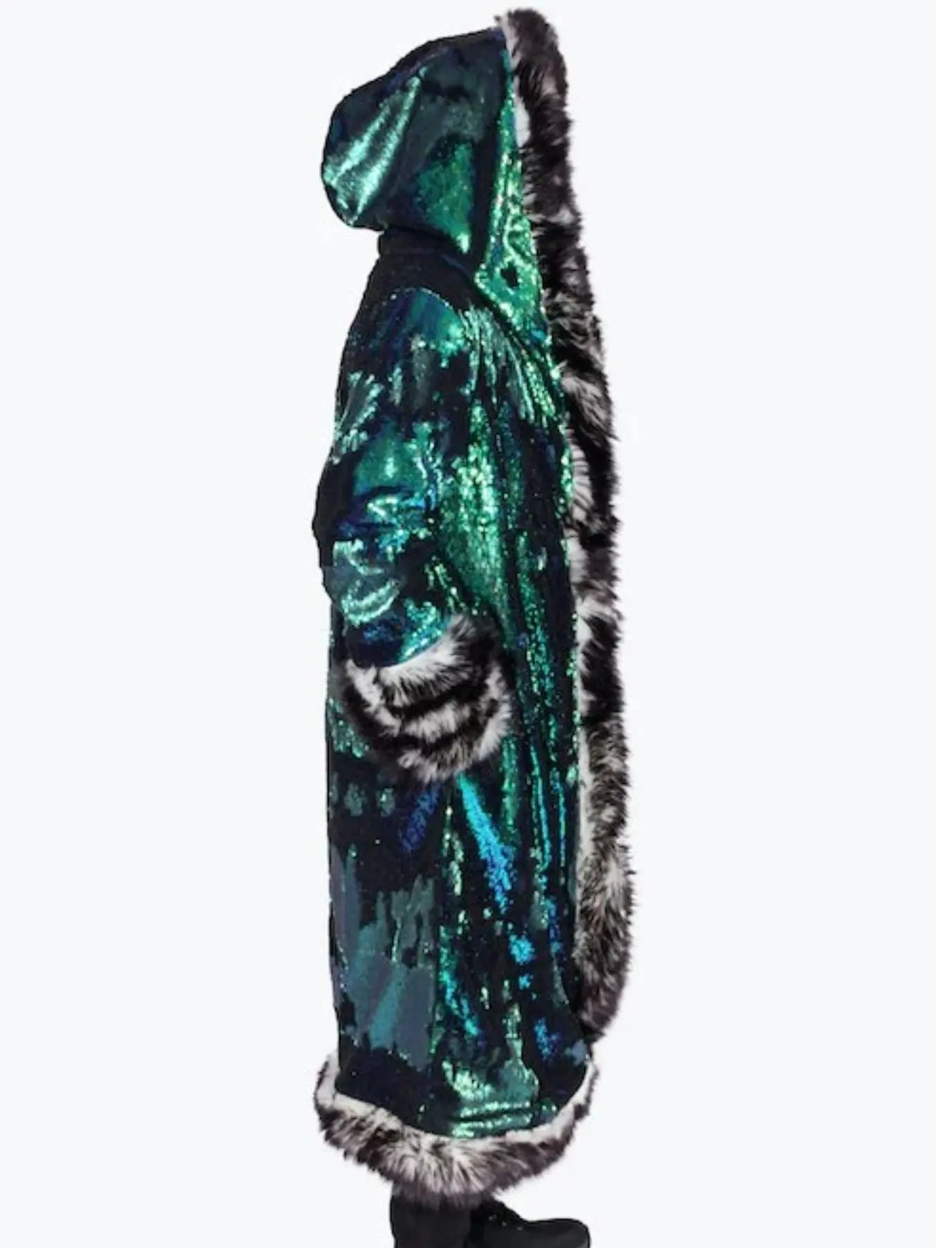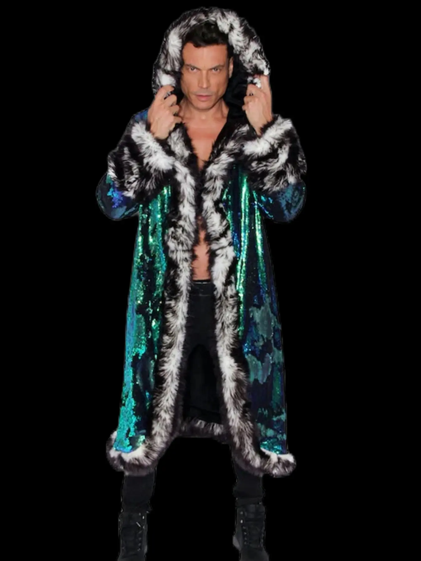 Men's LED Glow Hooded Jacket, Faux Fur Style, Colorful Light Strips, Plush Trim, Sequins, Festival Party Night Outwear