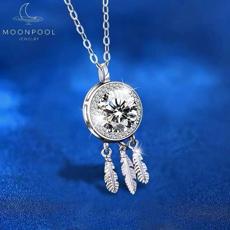 Dreamcatcher Design: Features a round moissanite or zircon gem surrounded by a halo of sparkling stones, with three delicate feather pendants for a whimsical look.
