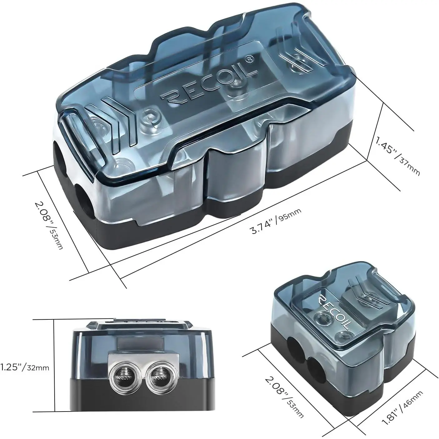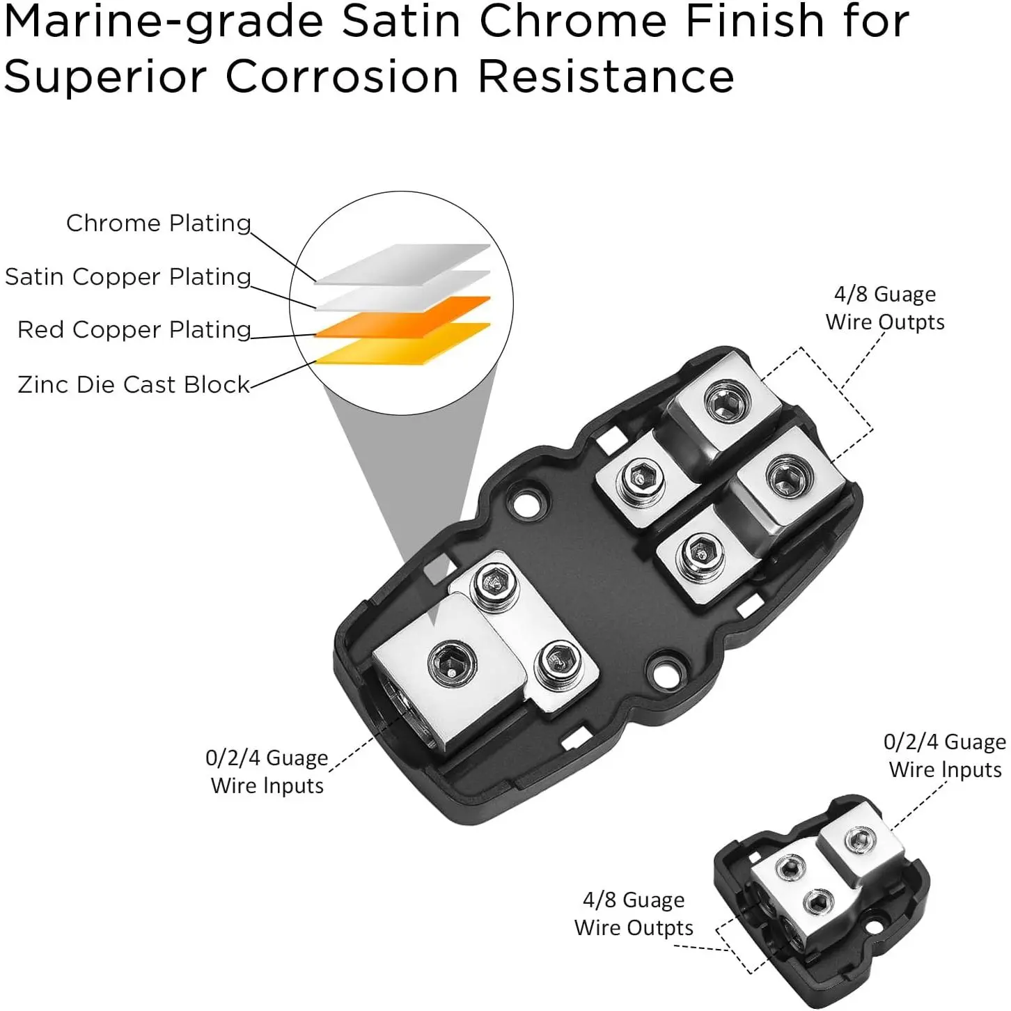 Dual Amplifier Fuse Distribution Combo Block with 2-Way Mini-ANL Fused Distribution and 2-Way Ground Distribution, Compatible with 0 Gauge, 2 Gauge, and 4 Gauge Power and Ground Cables for Enhanced Electrical System Management and Secure Power Distribution in Car Audio Installations