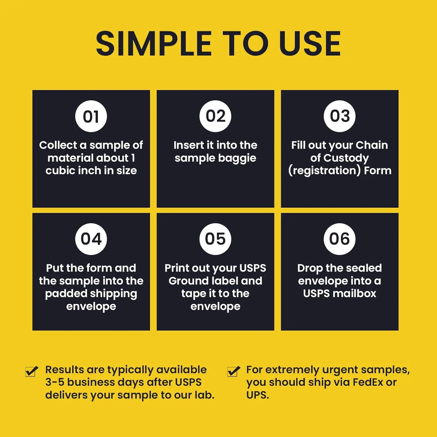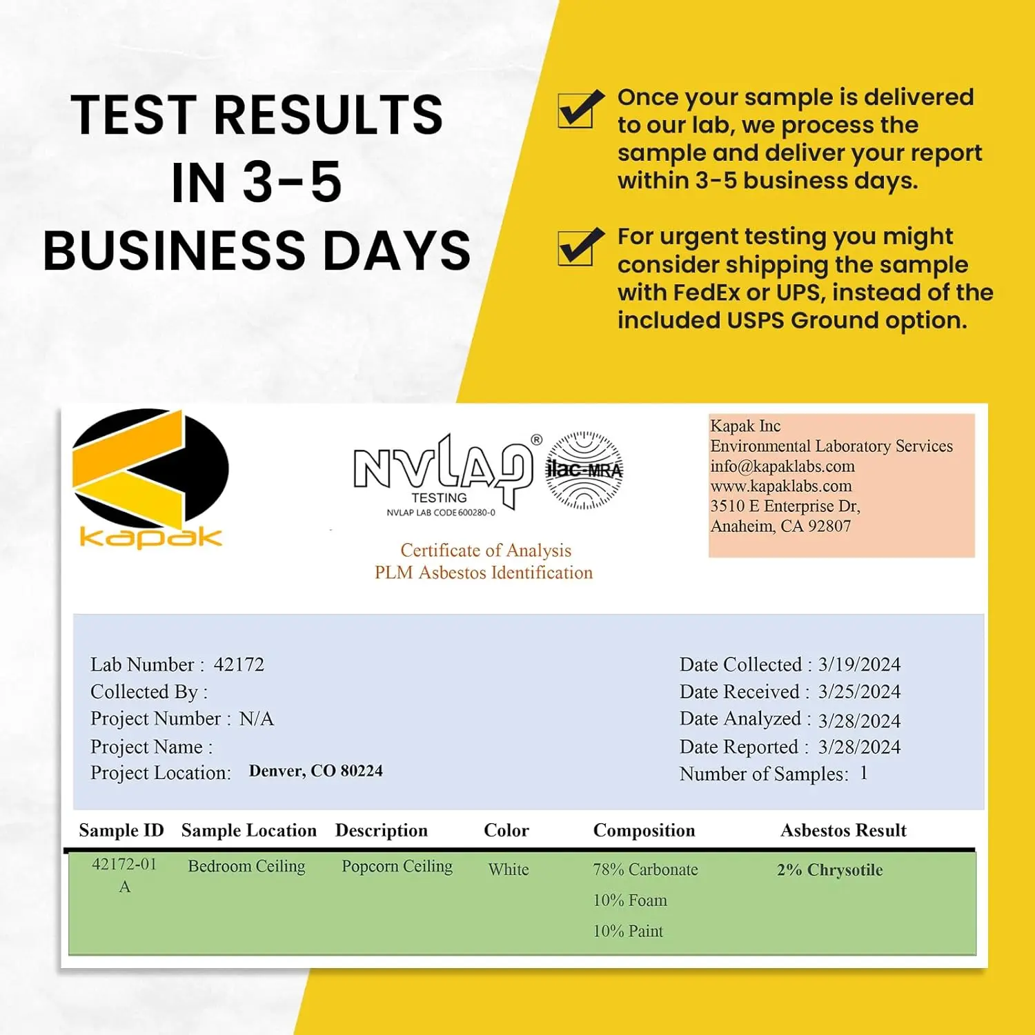 ✅DIY Sampling & Certified Lab Analysis – All-in-One Kit – Includes test device, prepaid return mailer, and NVLAP-accredited laboratory service for asbestos content analysis in solid building materials.