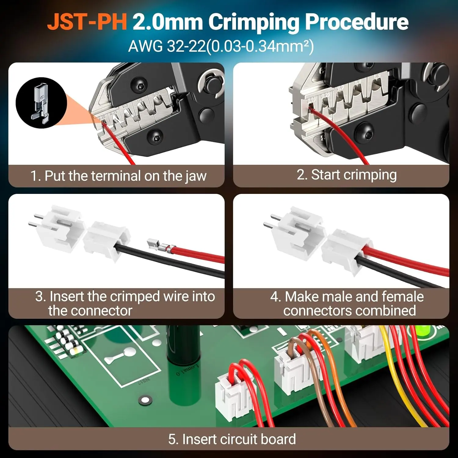 PROFESSIONAL CRIMPING TOOL: The kit includes crimping pliers AWG28-16/0.08-1.5mm², 180Pcs 2.54mm connectors, 200Pcs 2.5mm JST-XH connectors, 240Pcs 2.0mm JST-PH connectors, 1600Pcs pins and a double-layer portable storage box for easy carrying and organization.
