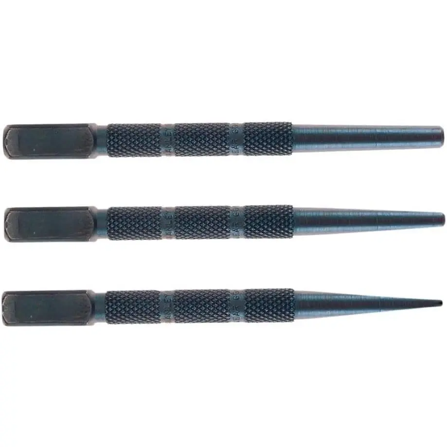 3-Piece Steel Nail Setter Kit with Polished Finish for Precision Woodworking and Carpentry Projects, Includes Multiple Punch Sizes for Flush and Countersunk Nail Setting, Durable Alloy Steel Construction for Long-Lasting Use in Framing, Trim, and Furniture Assembly.