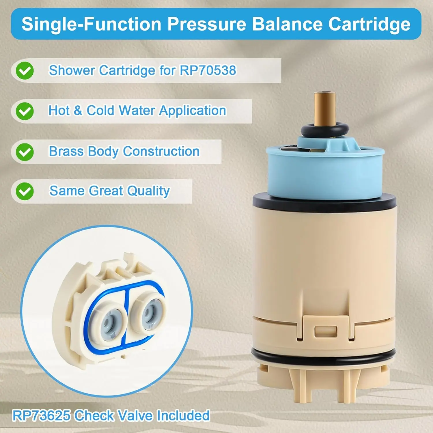 Product Details: single function pressure balance cartridge replacement for RP70538, with RP73625 check valve, It is compatible with Peerless/Delta single handle tub and shower faucet, shower cartridge suitable for Delta Foundation series, include cartridge and check valve