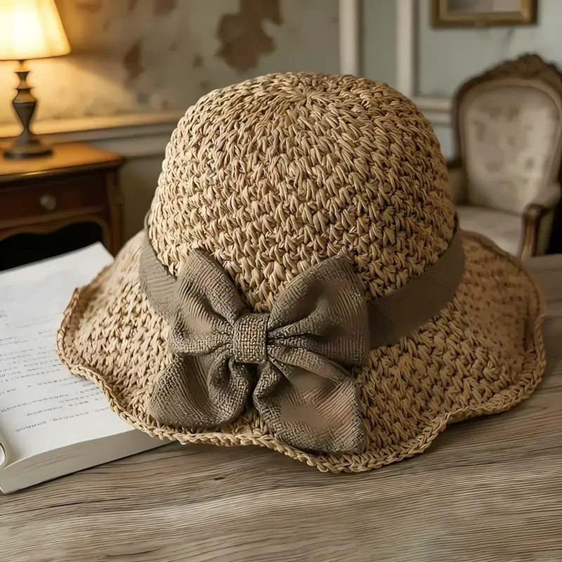 Vintage Woven Handmade Straw Hat with Ruffle Bow, Elegant French Style Sun Hat, Foldable & Breathable Beach Hat for Travel & Outdoor