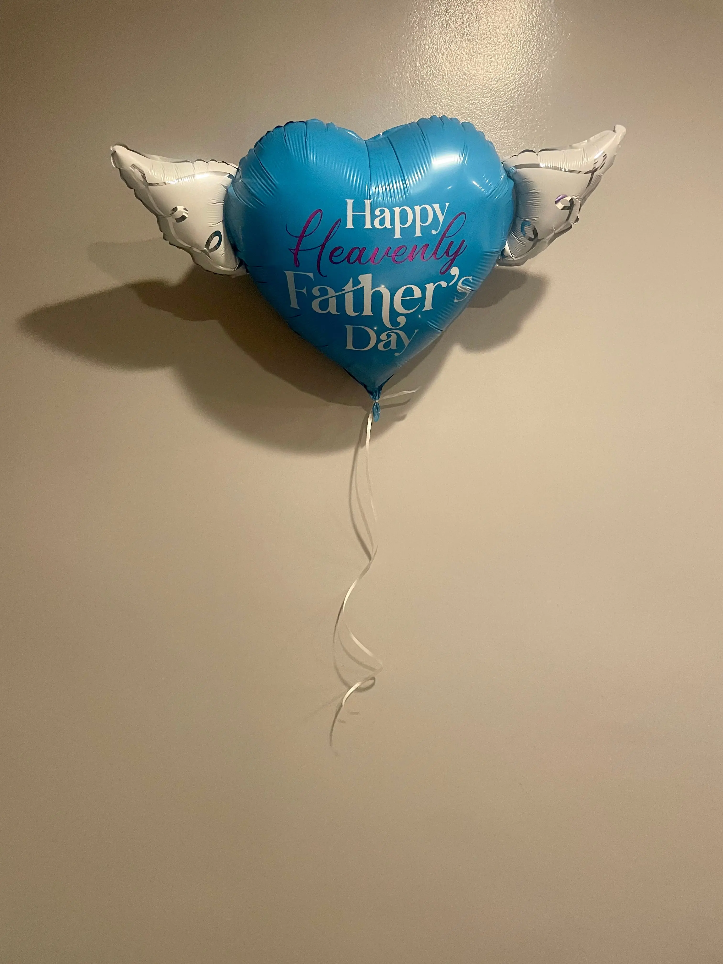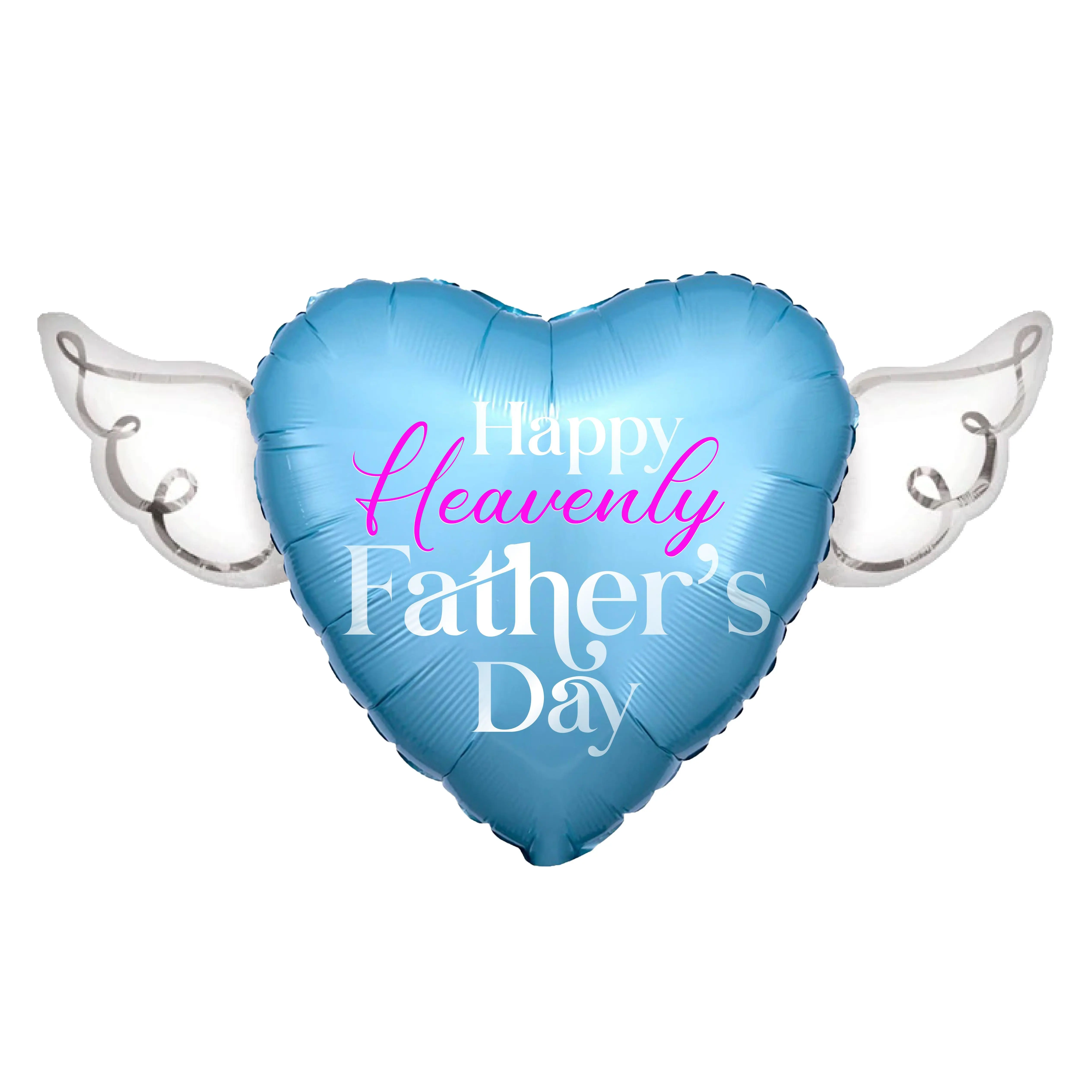 17" heart-shaped balloon with delicate white angel wings and a heartfelt "Happy Heavenly Father's Day" message — tender and deeply personal.