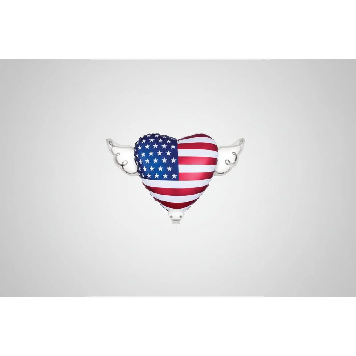 Heart-shaped balloon with bold American flag design and delicate white angel wings