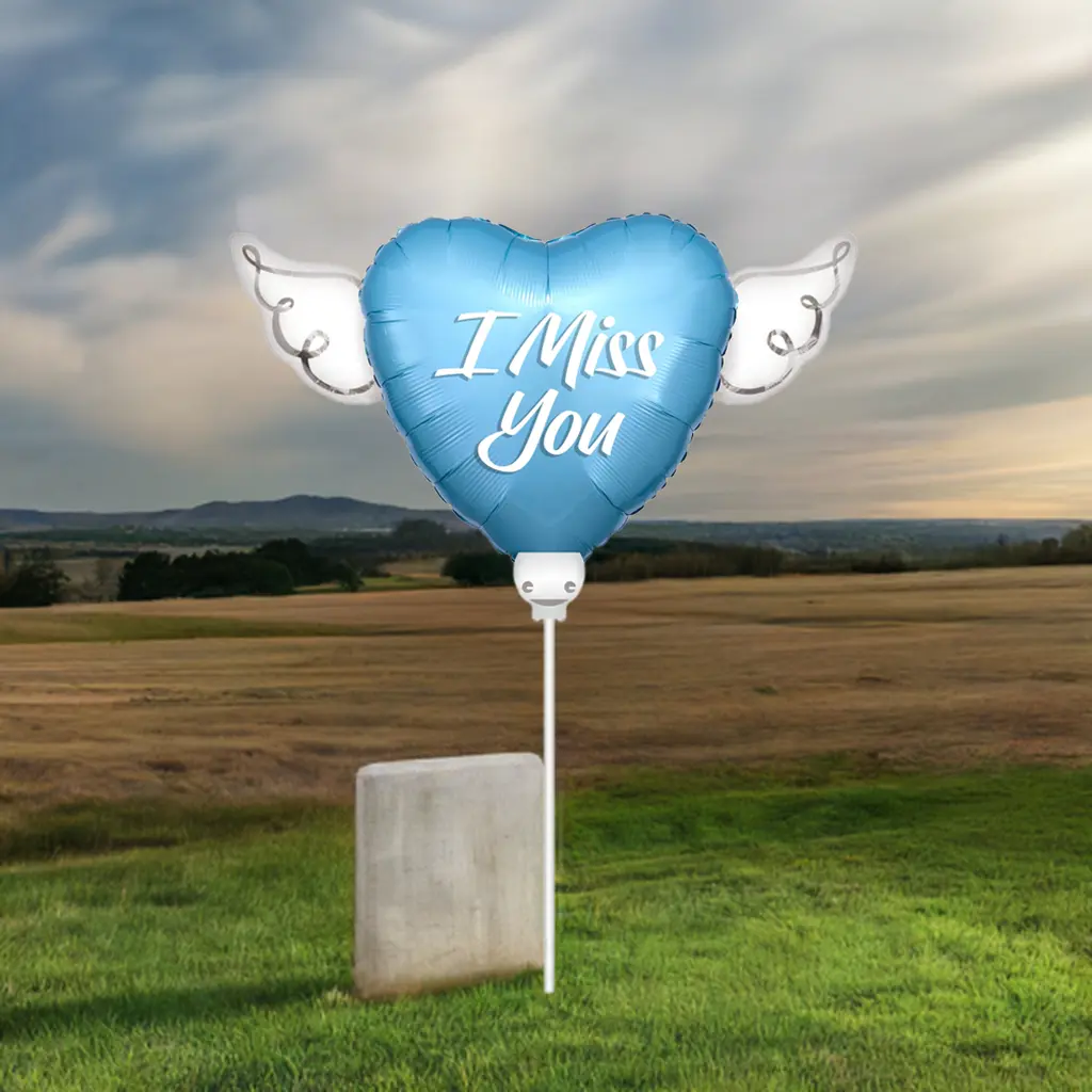 This beautiful heart-shaped balloon features delicate white angel wings and a heartfelt I Miss You message, arriving pre-mounted on a display stick for effortless placement directly into the ground at a graveside, headstone, or grave marker. Available in soft pink and calming blue — choose the color that best reflects your loved one's spirit or the unique bond you shared. No helium needed — simply inflate with air, clip onto the display stick, and press directly into the soil for an instant and deeply meaningful tribute that stands with quiet honesty at the graveside and says everything the heart is feeling.