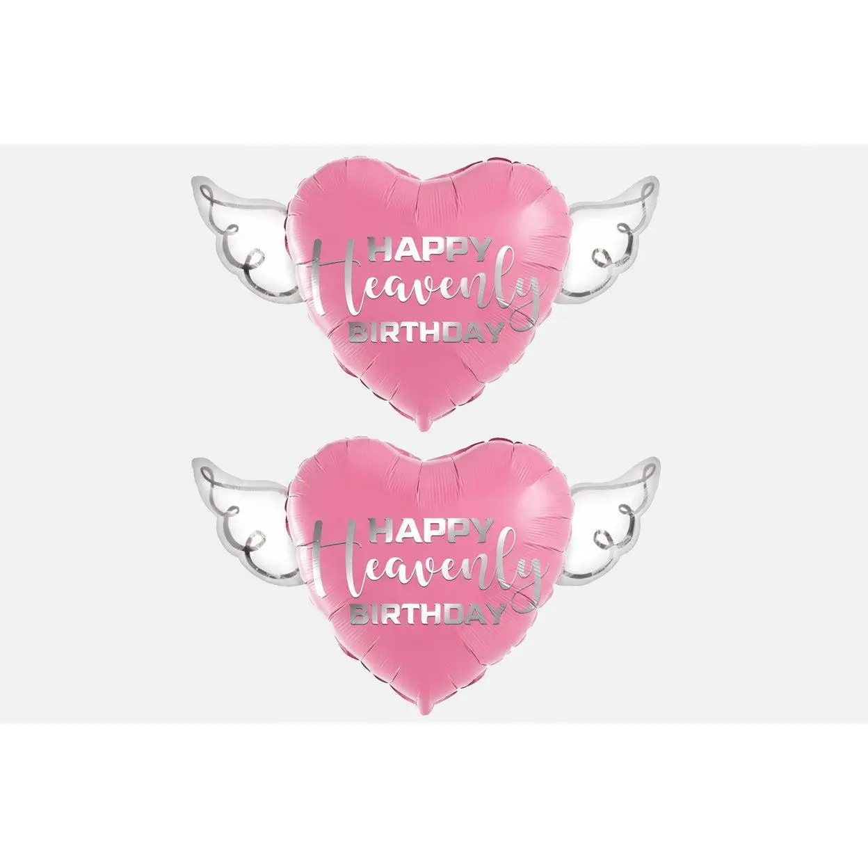 2 x Soft pink heart-shaped Happy Heavenly Birthday memorial balloon with angel wings