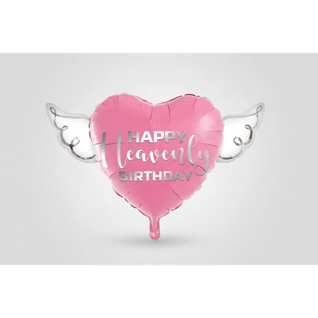 This beautiful soft pink heart-shaped balloon features delicate white angel wings and the complete "Happy Heavenly Birthday" message written in stunning silver script — a classic, timeless, and deeply personal design that creates a touching display at any headstone, grave marker, or memorial site. The elegant silver lettering against the soft pink heart creates a gentle yet striking visual tribute that is warm enough to feel personal and beautiful enough to truly honor the occasion.