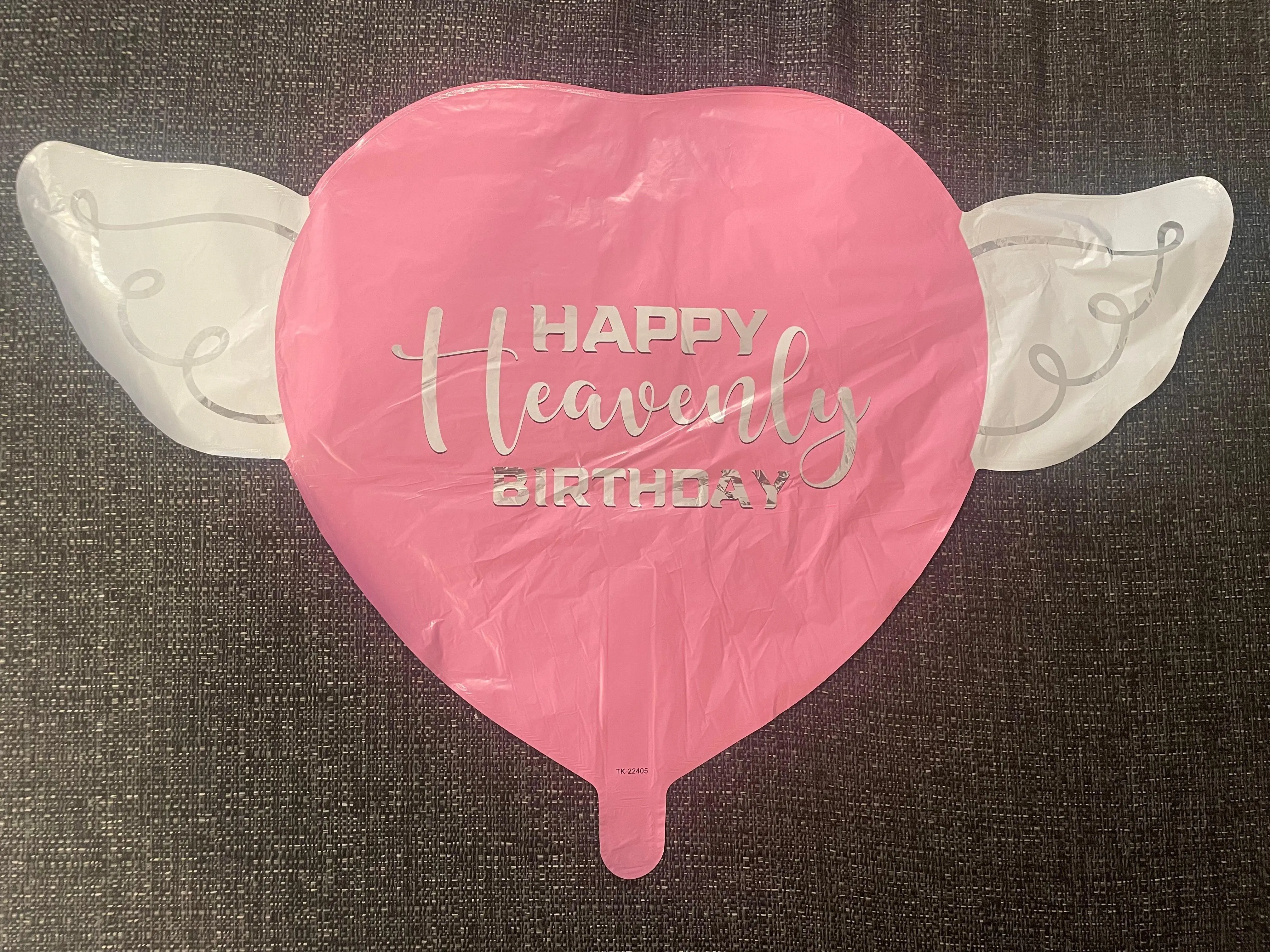 Whether you are visiting the graveside on a heavenly birthday, honoring a beloved woman at a celebration of life ceremony, marking a memorial anniversary, or simply bringing a moment of warmth and tenderness to a cemetery visit — this Pink Happy Heavenly Birthday balloon with silver script angel wings is a beautiful and lasting way to say your birthday still matters, you are still celebrated, and you are forever loved.
