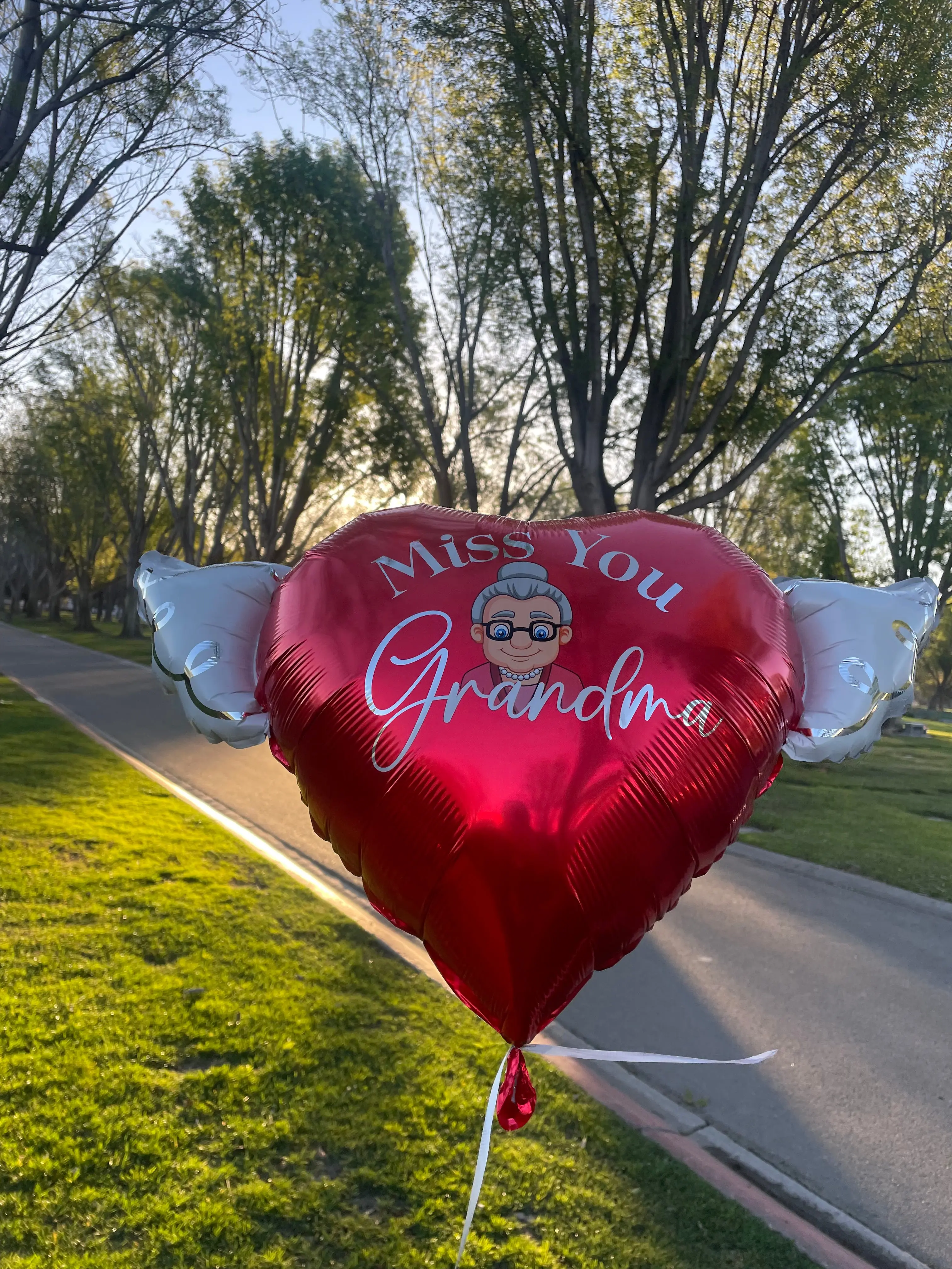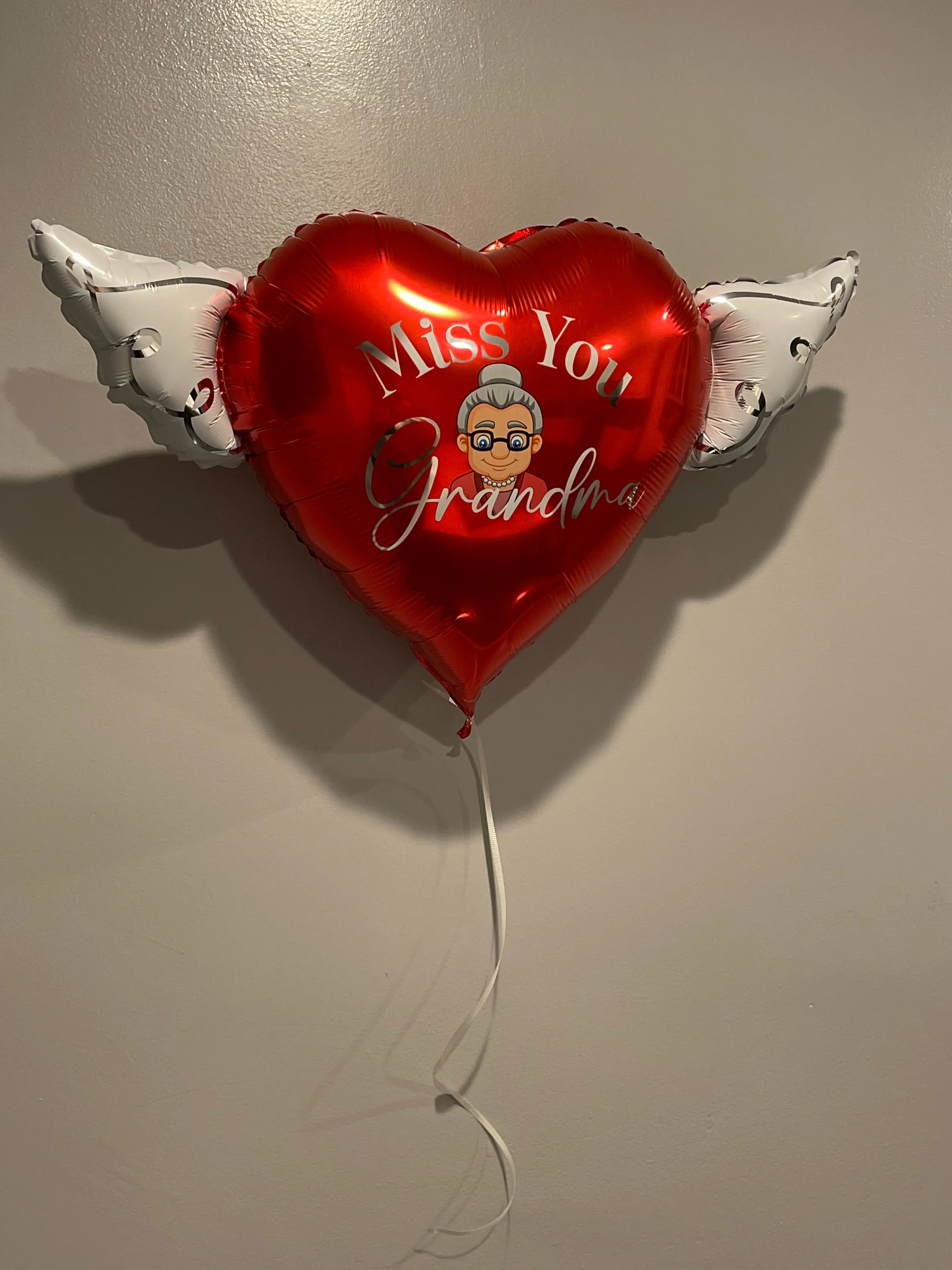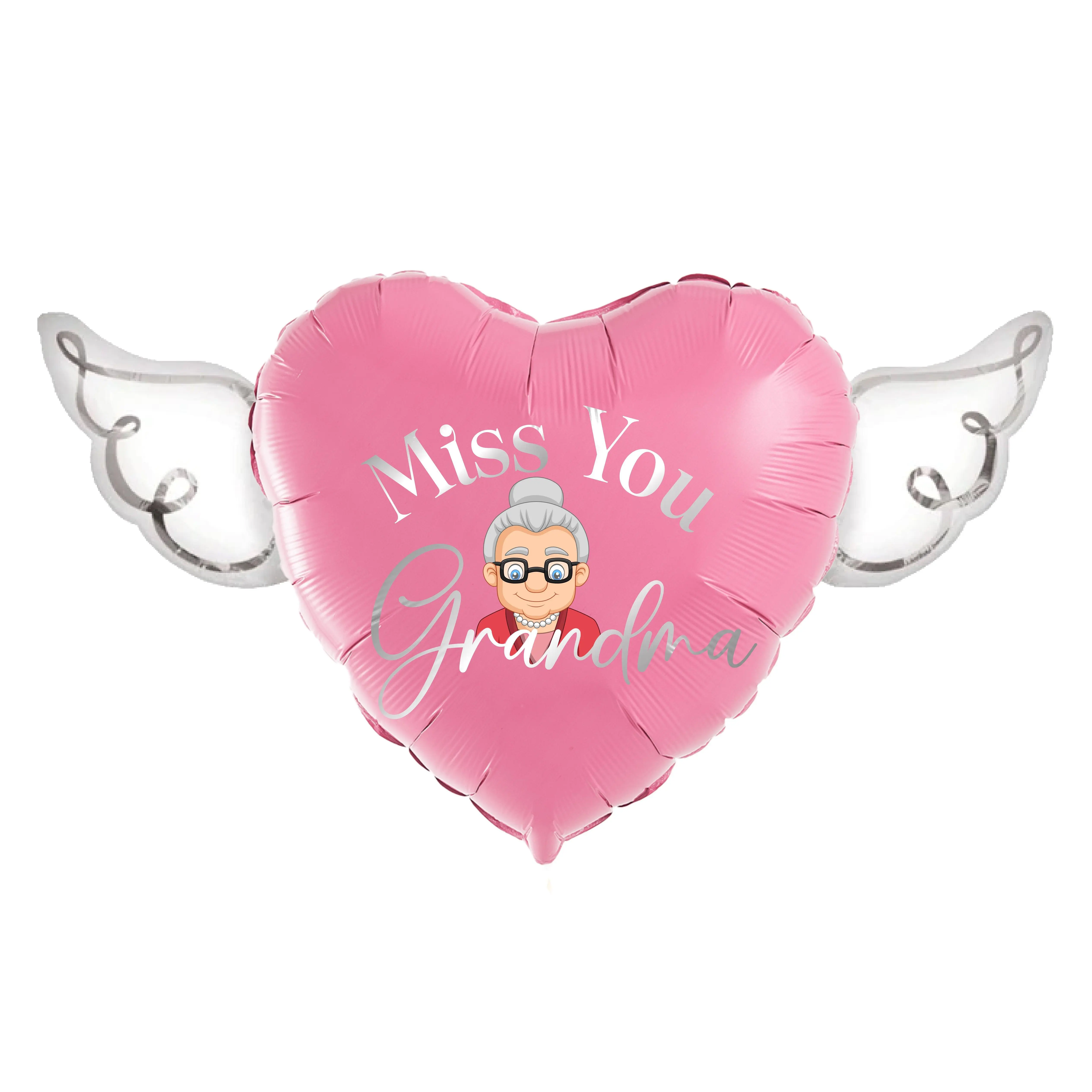 17" heart-shaped balloon with delicate white angel wings and a heartfelt "Miss You Grandma" message — tender and deeply personal.