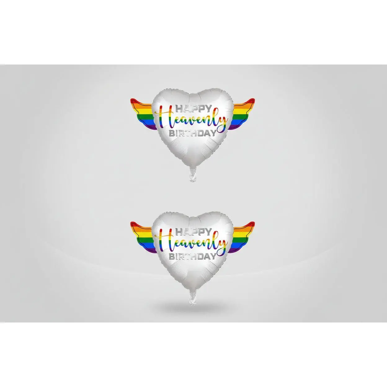 2 x Colorful heart-shaped Happy Heavenly Birthday memorial balloon with rainbow angel wings