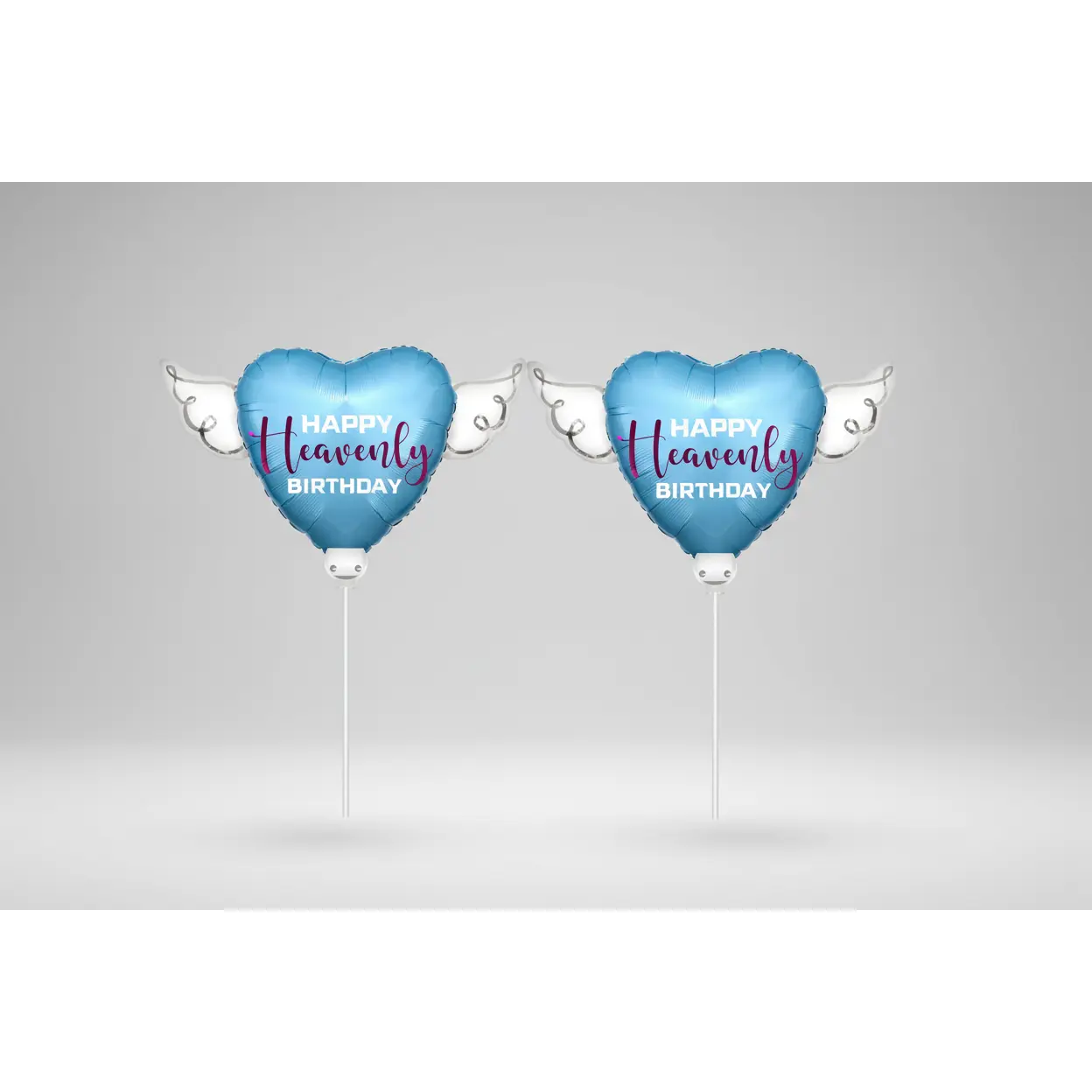 2 x Soft blue heart-shaped Happy Heavenly Birthday memorial balloons with angel wings