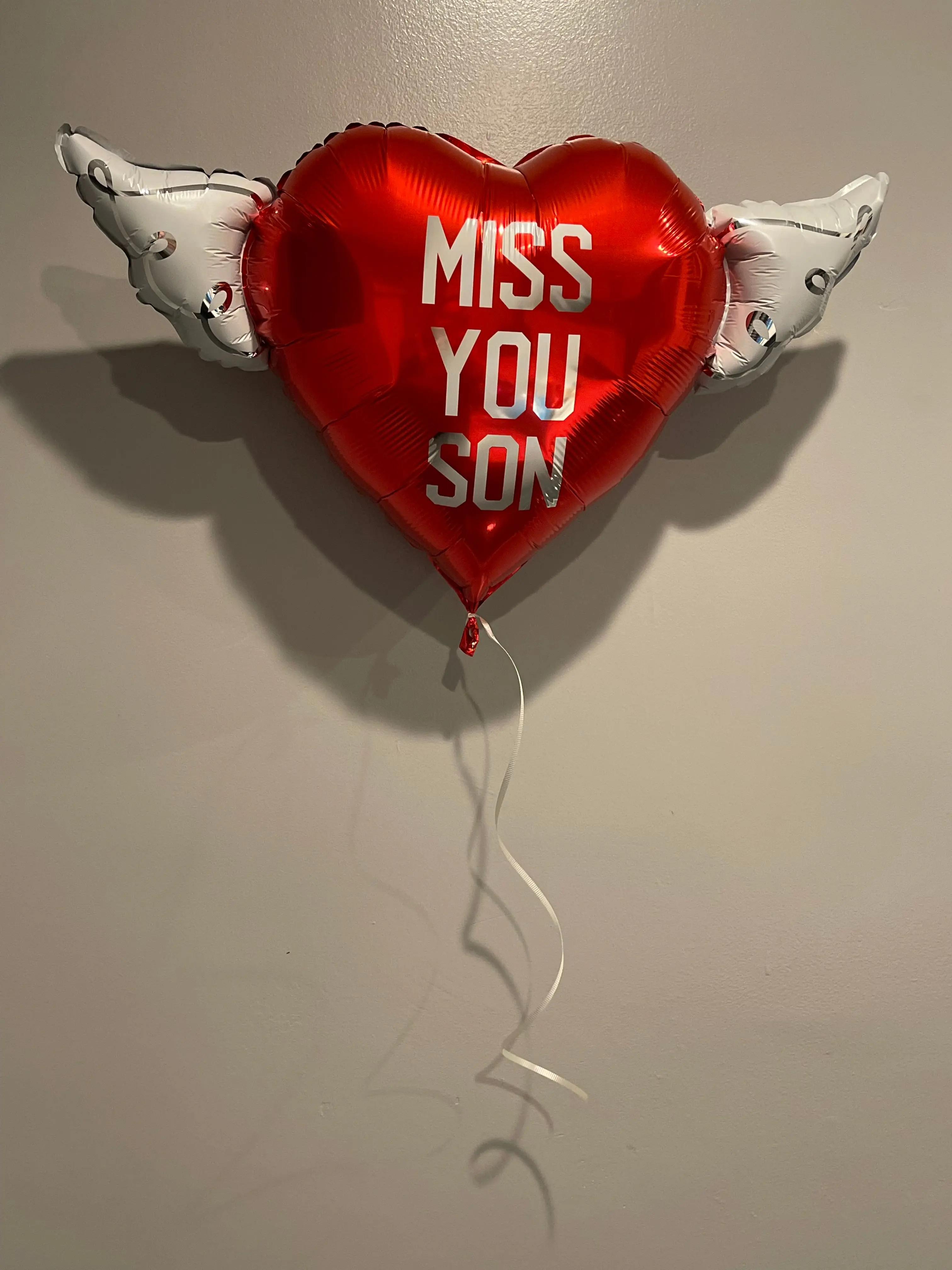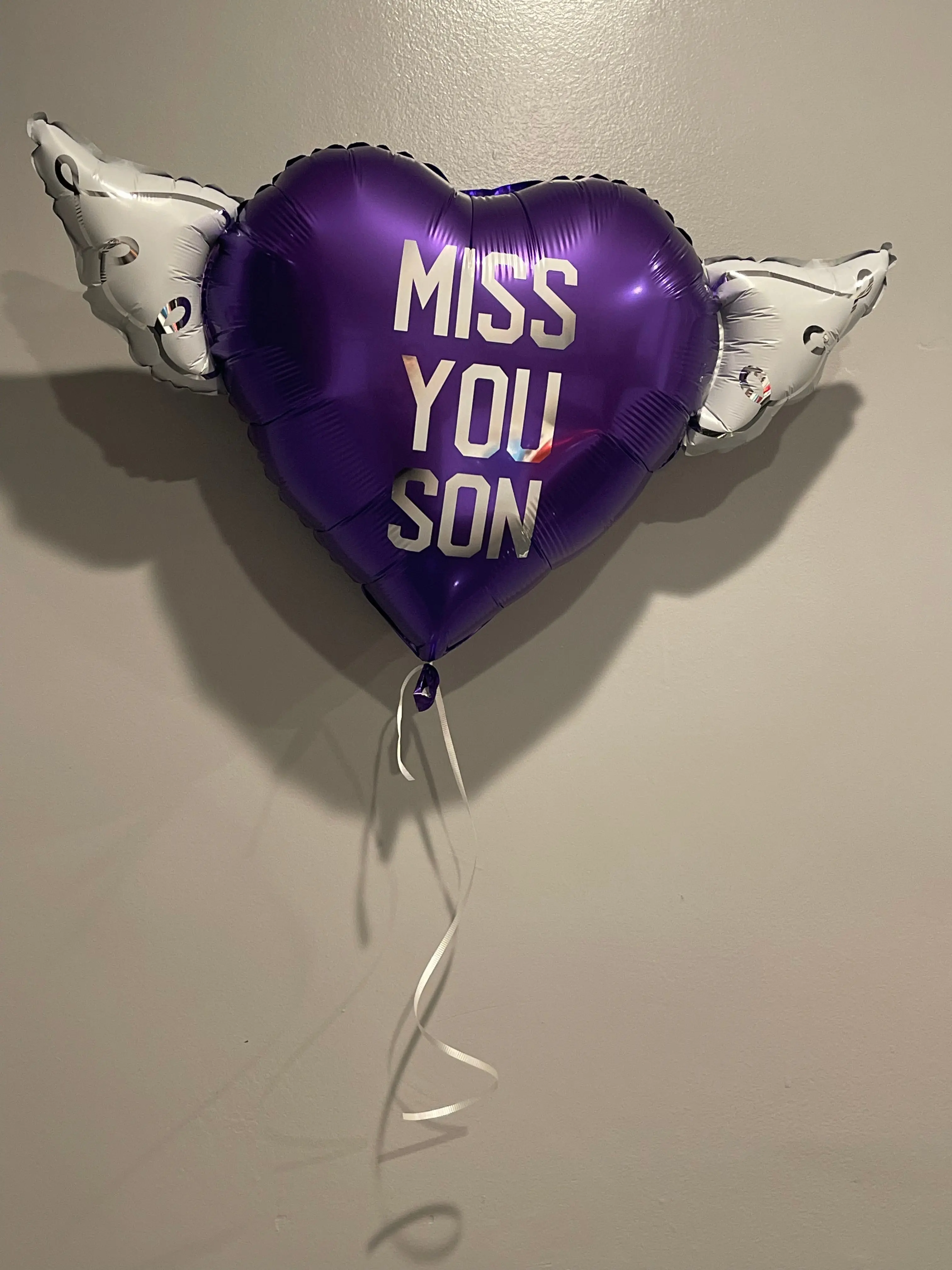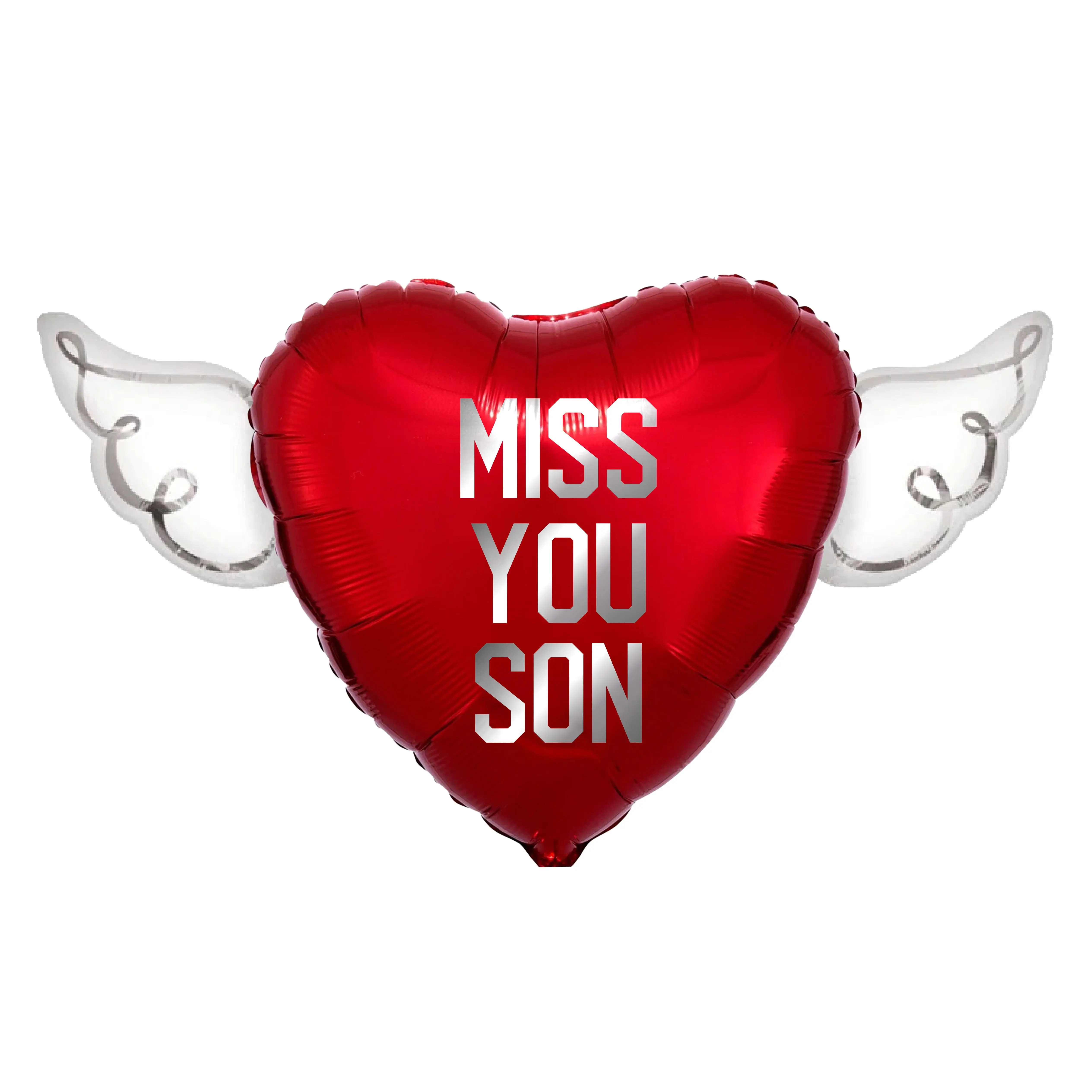 17" heart-shaped balloon with delicate white angel wings and a heartfelt "Miss You Son" message — honest and deeply personal.