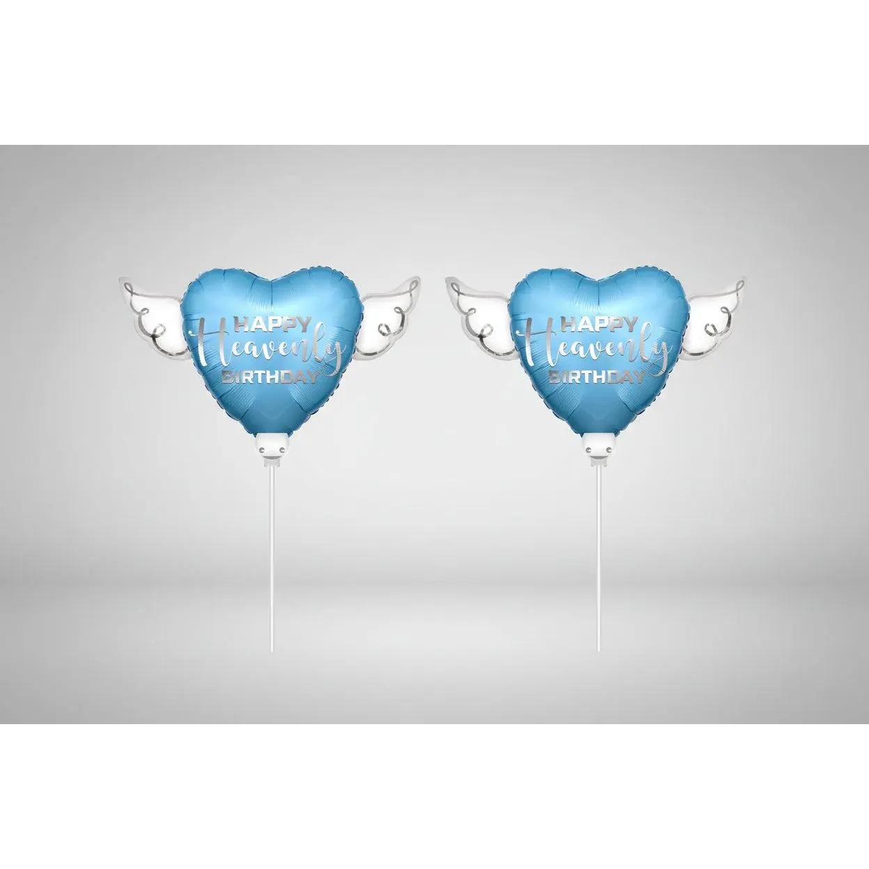 2 x Soft blue heart-shaped Happy Heavenly Birthday memorial balloons with angel wings