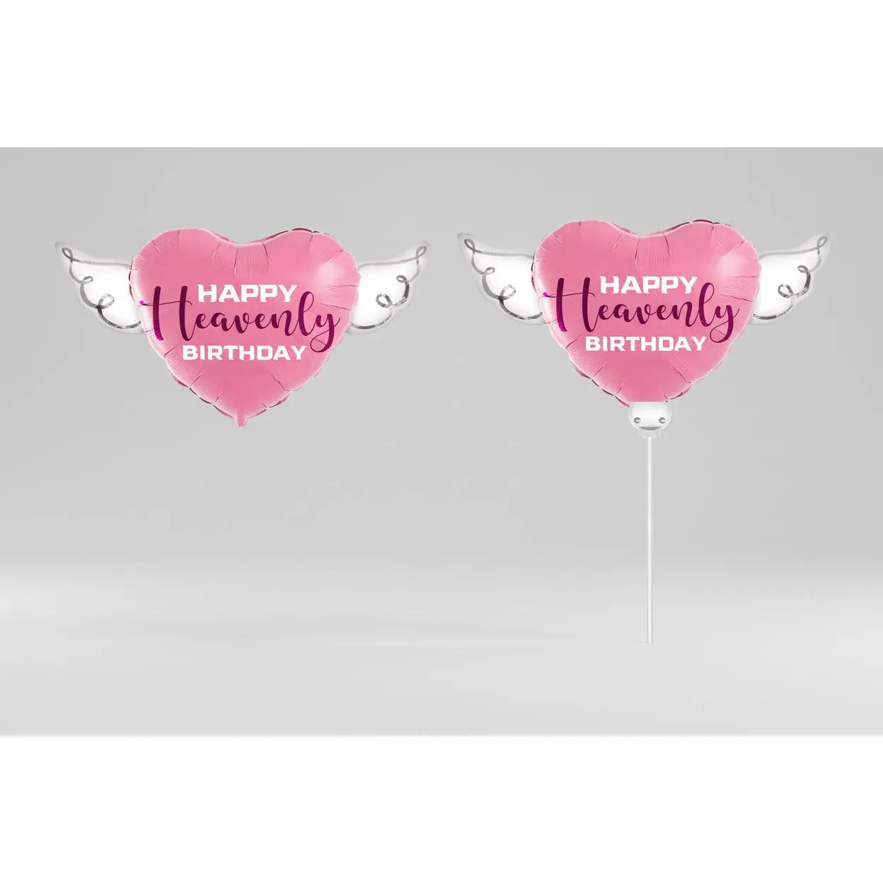 1 x 8" soft pink heart-shaped Happy Heavenly Birthday memorial balloon on a stick with angel wings