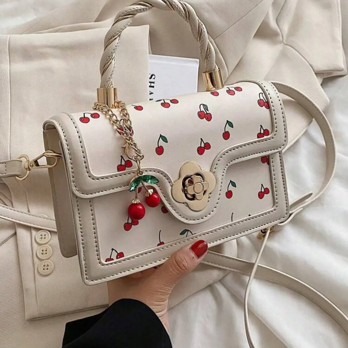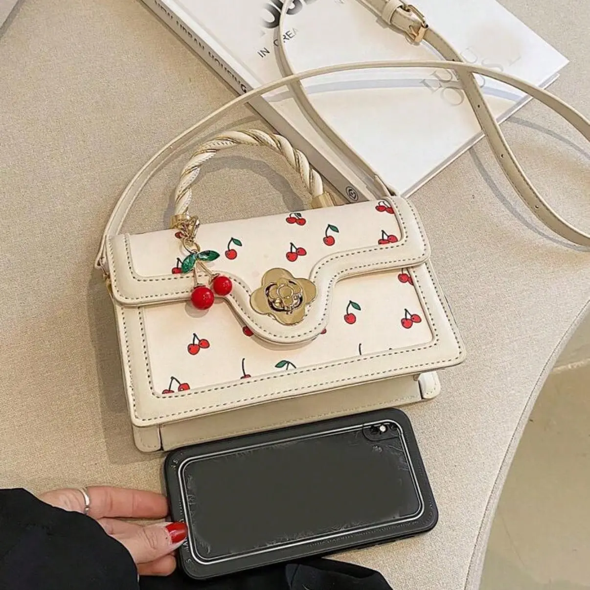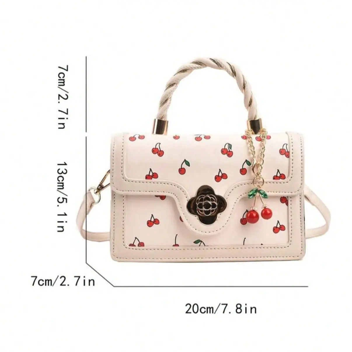 Fashionable High-End Pu Handbag Crossbodybag for Woman, Tote Bag With Versatile Square Shape Cute Cherry Print Shoulderbag, Perfect For Shopping, Dating Or CrossBody For Girls Send Scarf.