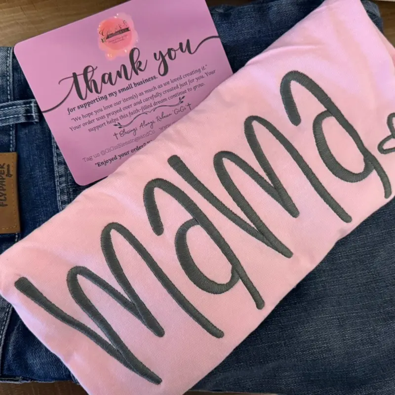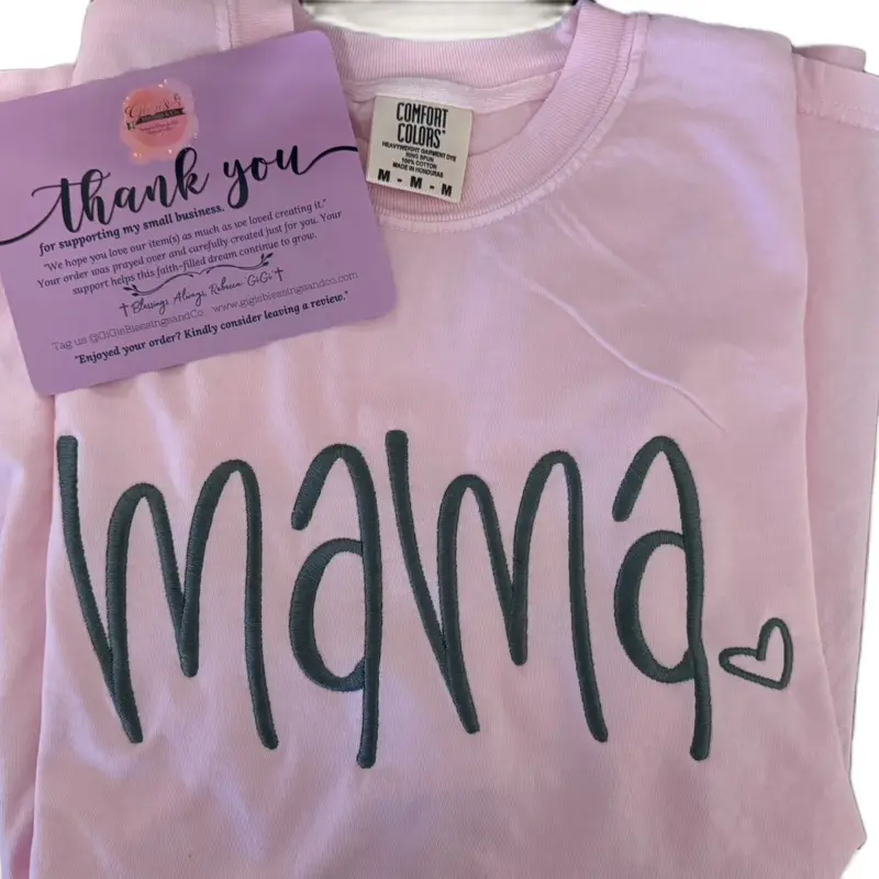 Our “Mama” tee is the perfect everyday essential—designed with love and made for comfort. Featuring a delicate script and a subtle heart detail, it’s effortlessly stylish for busy moms on the go.