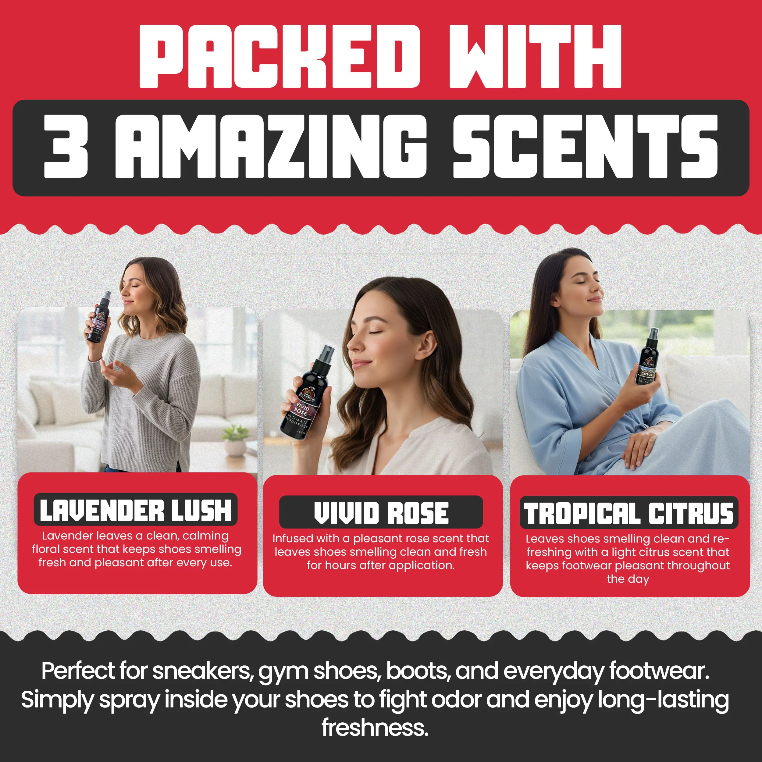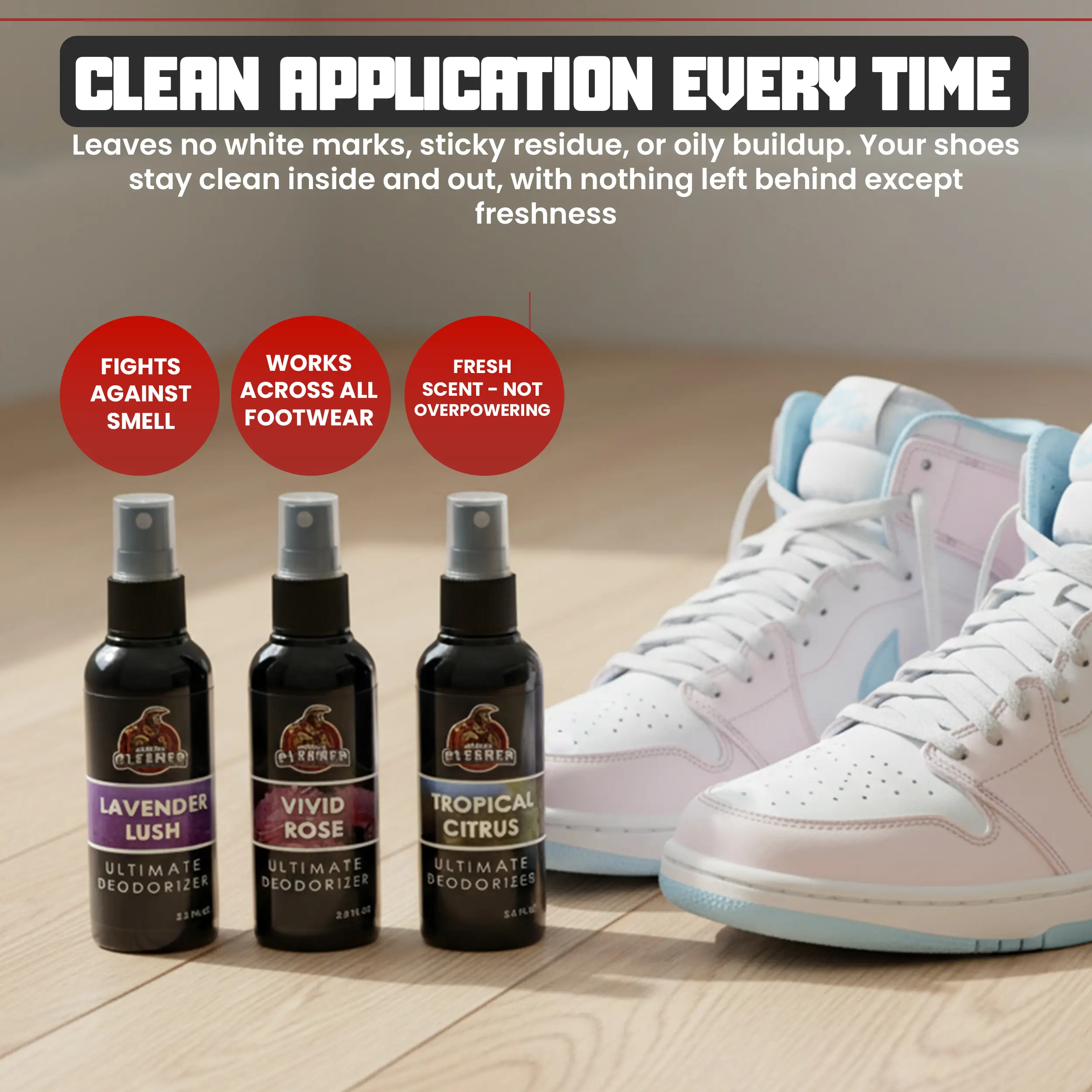 This is not just another spray that covers up odours for an hour and disappears. This is a heavy-duty odor eliminator that actually neutralises and destroys odours at the source, leaving behind a beautiful, long-lasting feminine fragrance that keeps your shoes and gear smelling brand new — every single time.