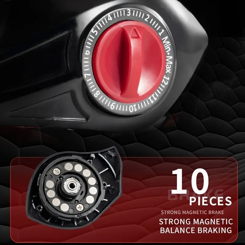 2. **Precision Magnetic Braking System**: Features a dual-row 10-point adjustable magnetic brake that provides consistent, spool-controlled braking power, drastically reducing the risk of backlash and bird's nests, perfect for beginners and pros alike.