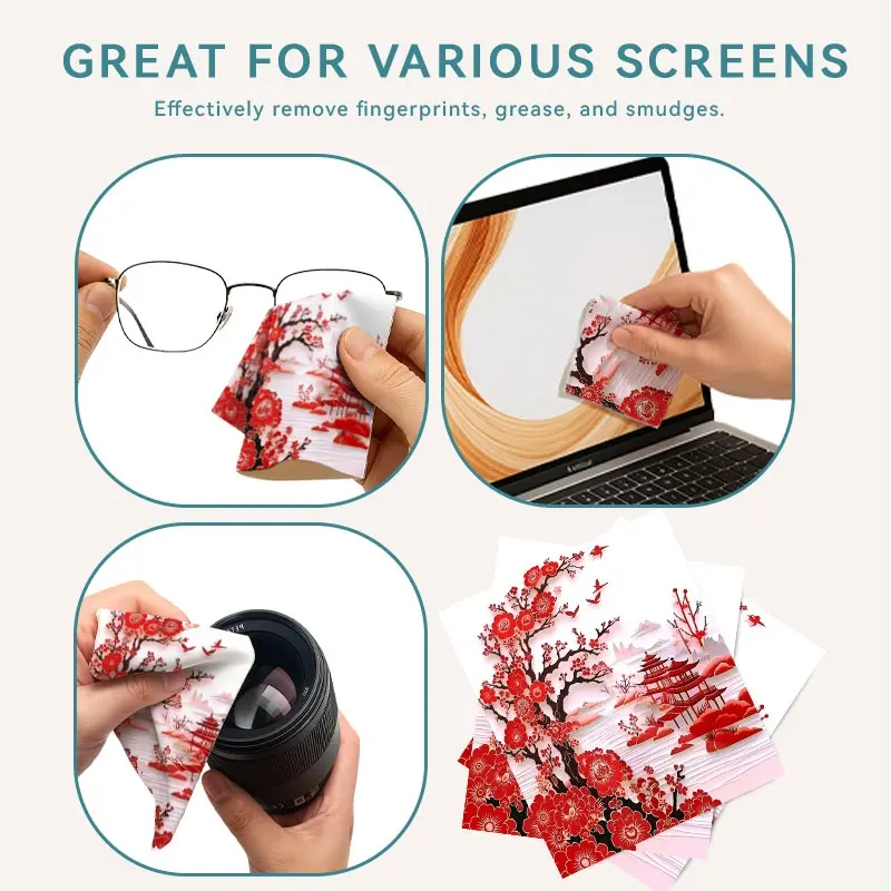1/3/6/14pcs Red Plum & Pavilion Style Cleaning Cloth, Multiple Specifications Available, Single - Sided, Ideal for Camera Lenses, Eyeglasses, Home & Daily Use, Gentle & Effective Cleaning, Traditional Art - Inspired Design