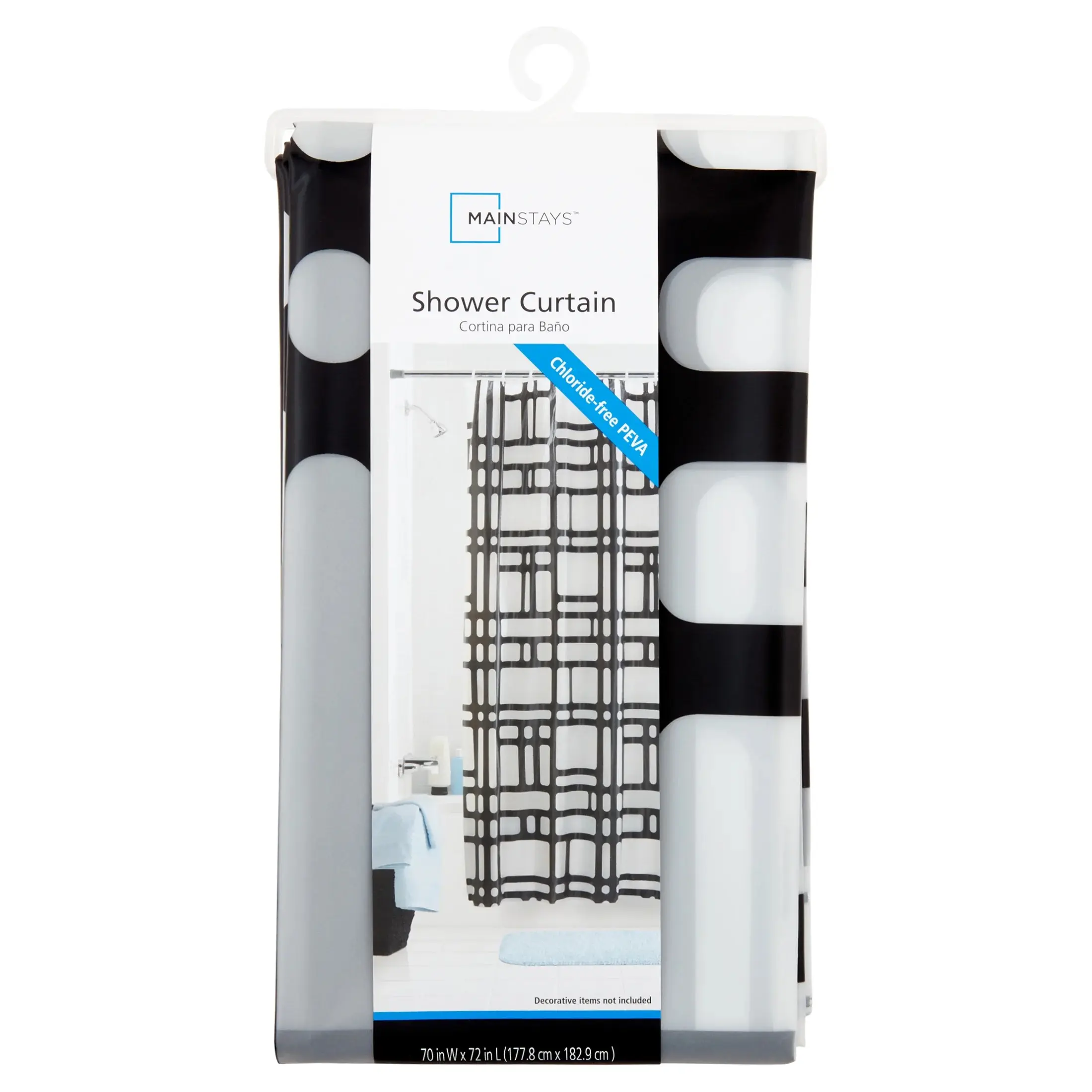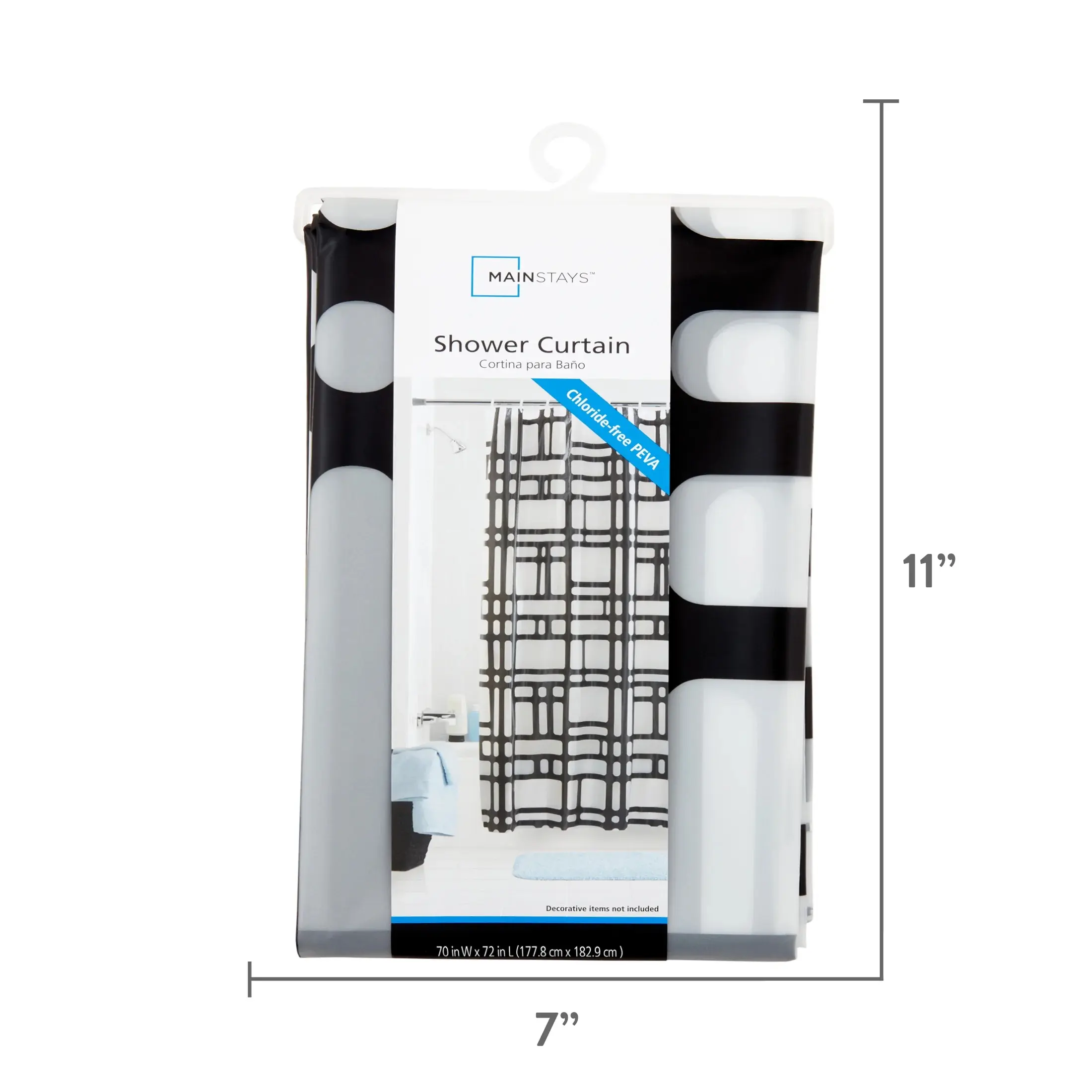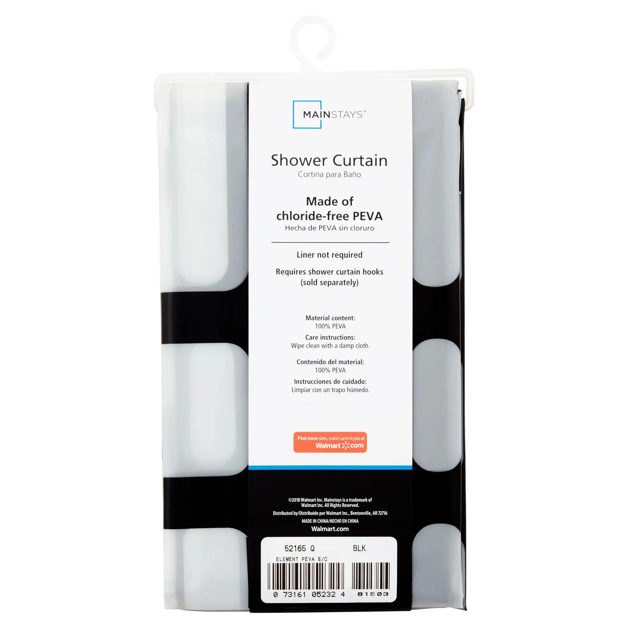 Add an unmistakably modern look to your bathroom decor with the Mainstays Elements Geometric PEVA Shower Curtain.The waterproof and odor-free PEVA shower curtain features a bold geometric design.The curtain can be used alone (to allow light into your shower) or paired with any fabric shower curtain.Measuring 70 inches by 72 inches, it fits in any standard-size shower and bathtub areas.Its durable buttonhole top construction is compatible with any hooks and rings.We recommend using the geometric shower curtain inside of the tub or shower.For easy care and cleaning, simply wipe the curtain with a damp cloth.