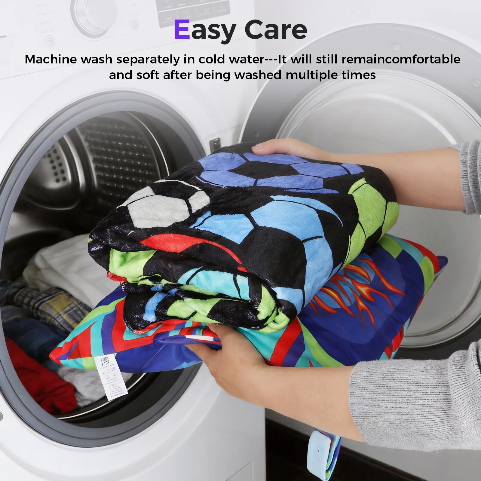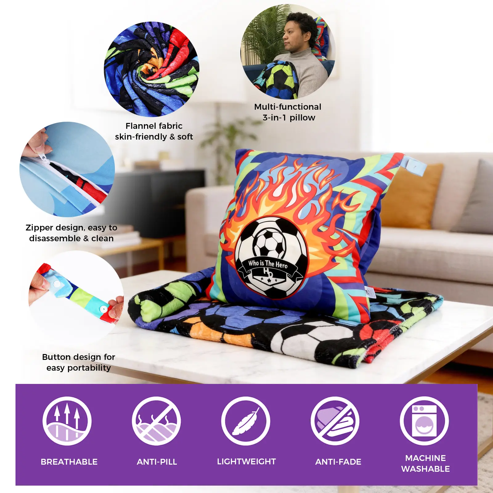 Ignite your soccer spirit with this dynamic 3-in-1 pillow blanket. The velvet pillowcase features a burning soccer ball surrounded by fiery flames, set on a background of purple, light blue, yellow-green, and red geometric blocks. Inside, the large flannel blanket (60"x79") displays a vibrant collection of soccer balls in many color combinations: purple-black, blue-black, red-black, yellow-black, light blue-black, green-black, and grey-black – piled together in a festive pattern. All pieces share a cohesive digital print. Side pockets warm your hands. Perfect for die-hard fans, sports bars, or man caves.