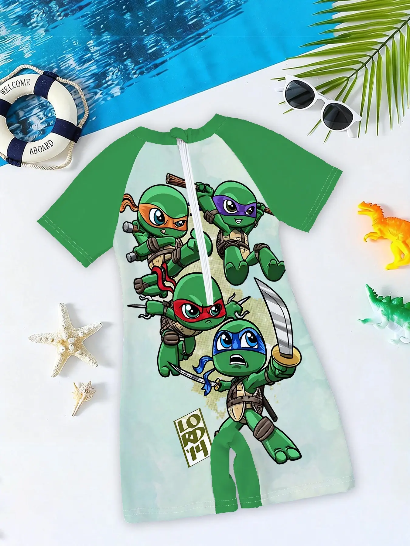 Boys' one-piece swimsuit "Chibi Ninja Turtles Team Edition" features all-over print of the four Chibi Ninja Turtles plus raglan green sleeves, cute and cool with sun protection, eye-catching for summer water play / beach vacations