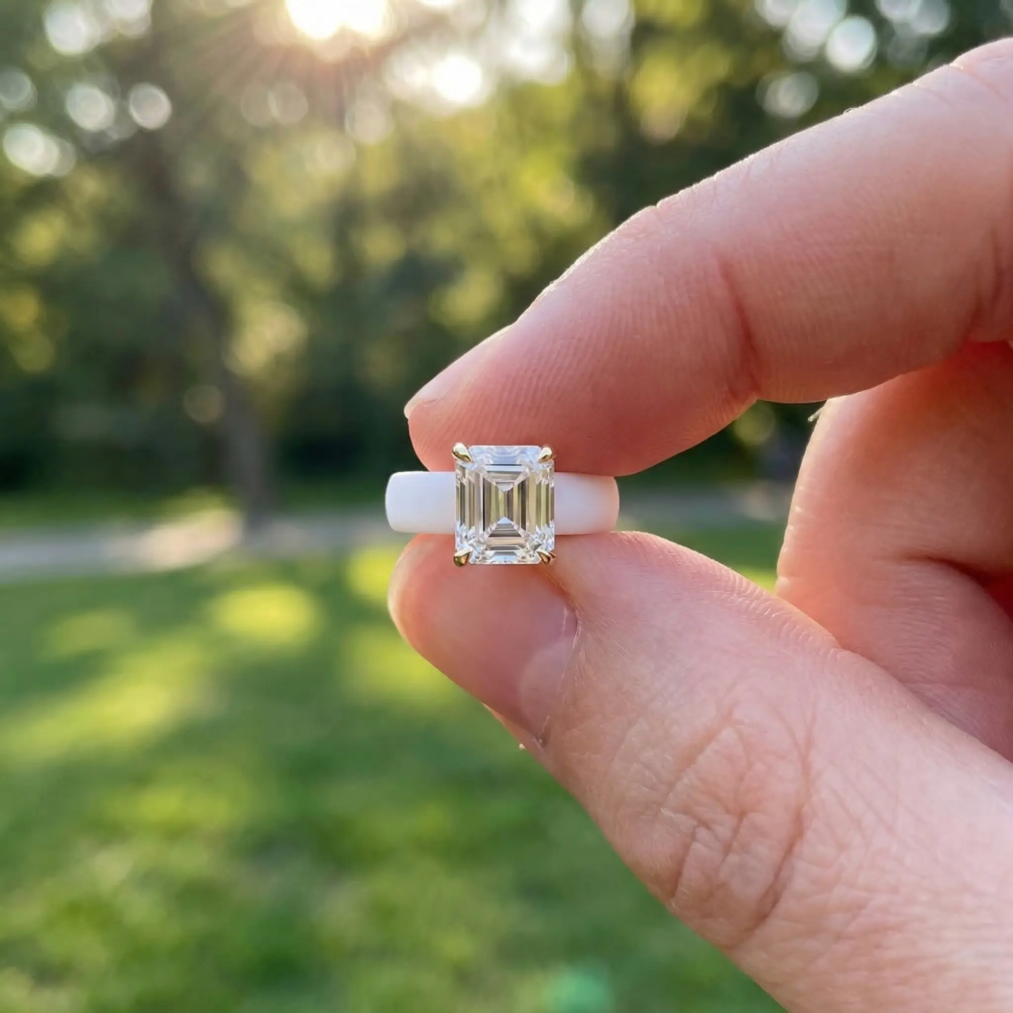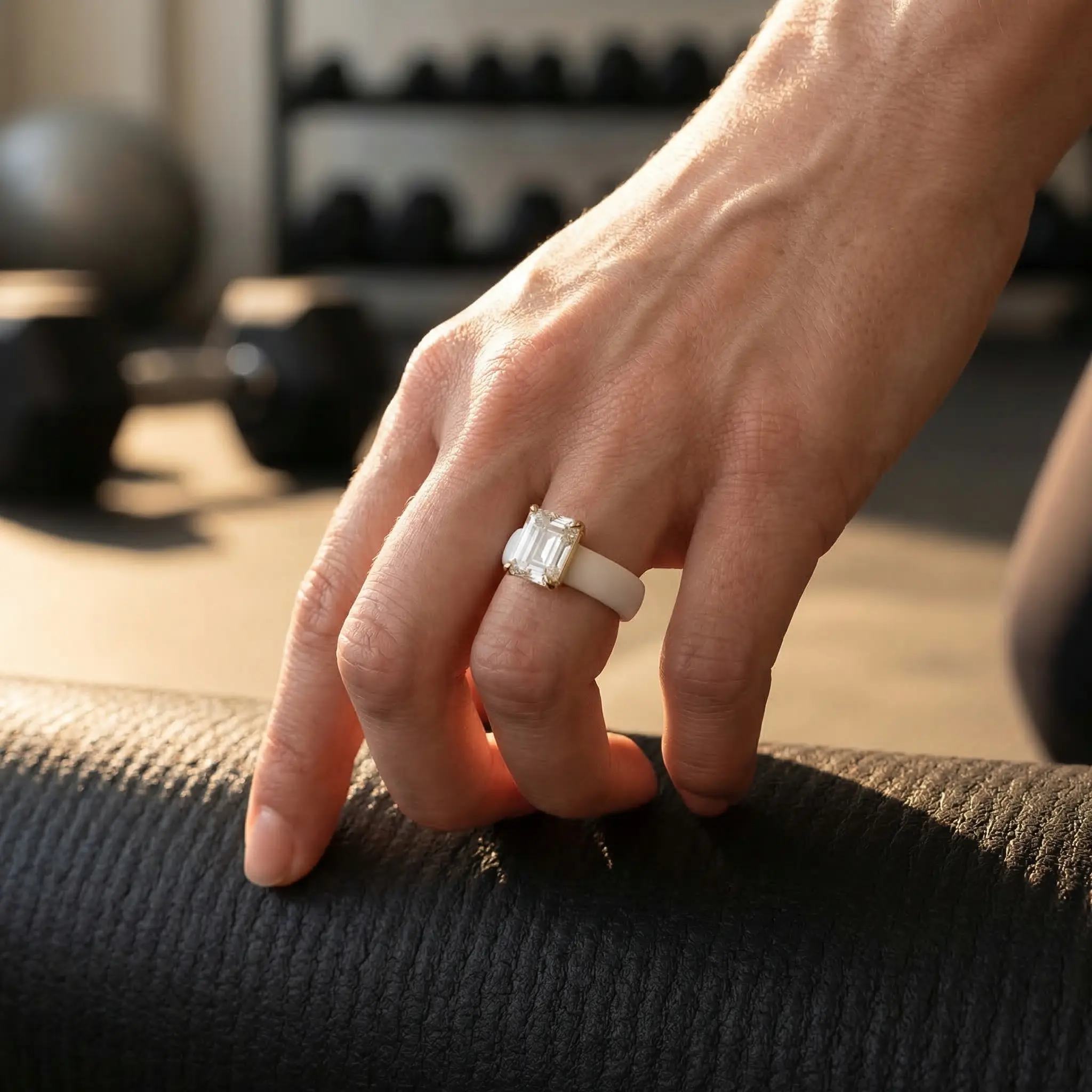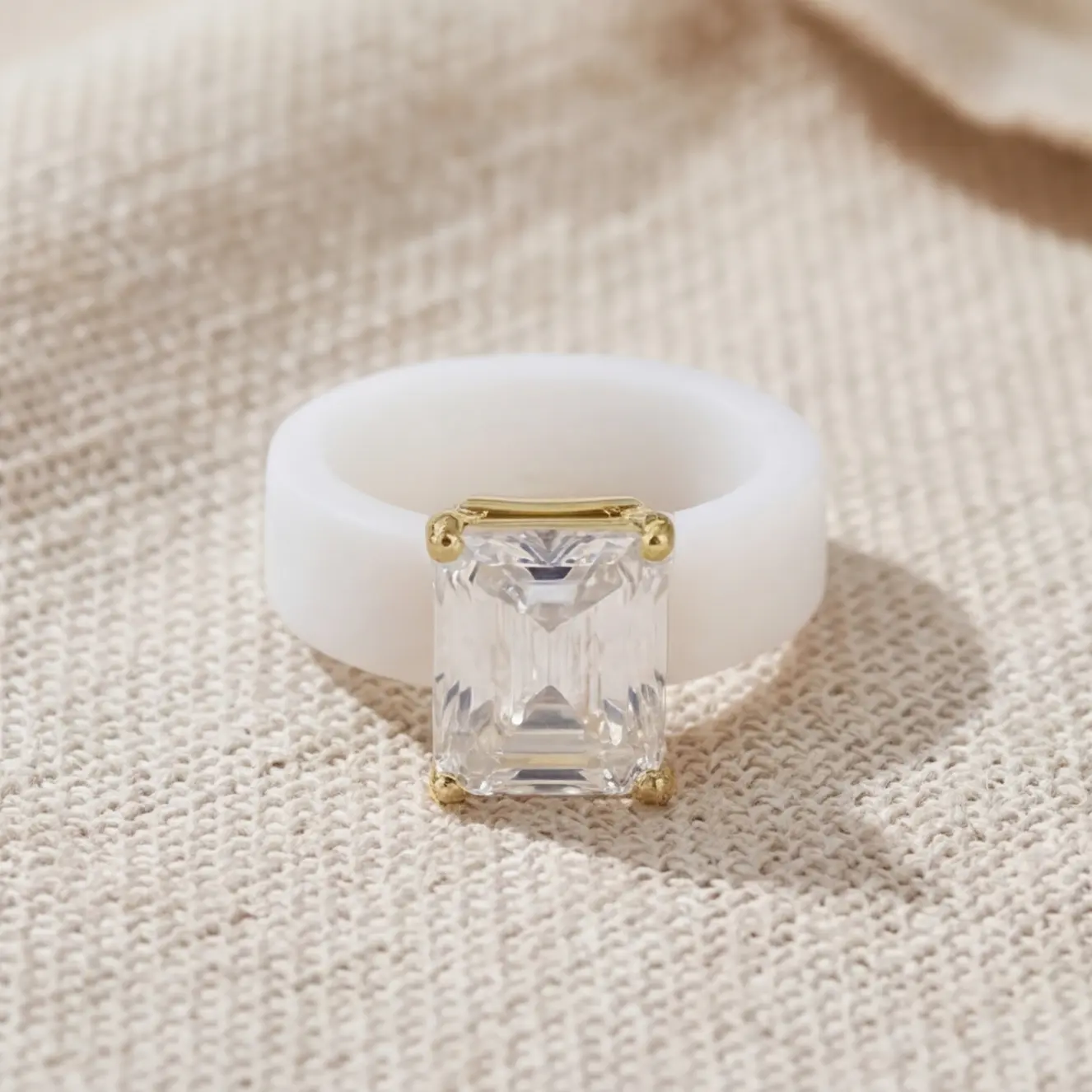 Add a modern twist to your jewelry collection with this elegant silicone ring featuring a dazzling emerald-cut zircon stone. Designed with a soft matte white silicone band and a sleek gold-tone setting, this ring combines comfort, style, and statement sparkle in one unique piece.