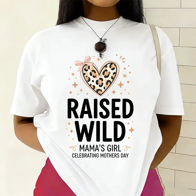Raised Wild Mama's Girl' Leopard Heart Print T-shirt Mother's Day Style Casual Top