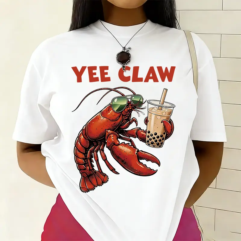 Yee Claw' Bubble Tea Lobster Funny Print T-shirt Foodie Humor Style Casual Top