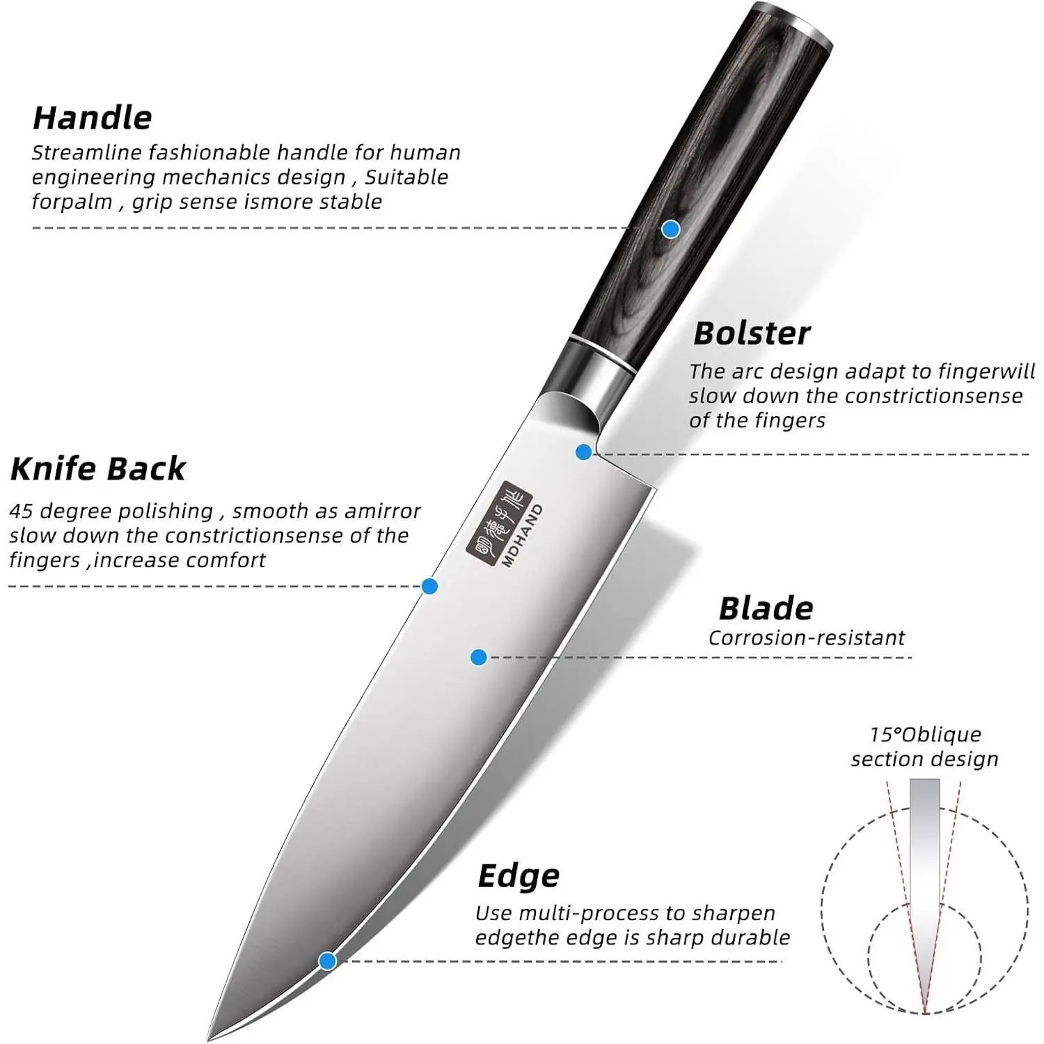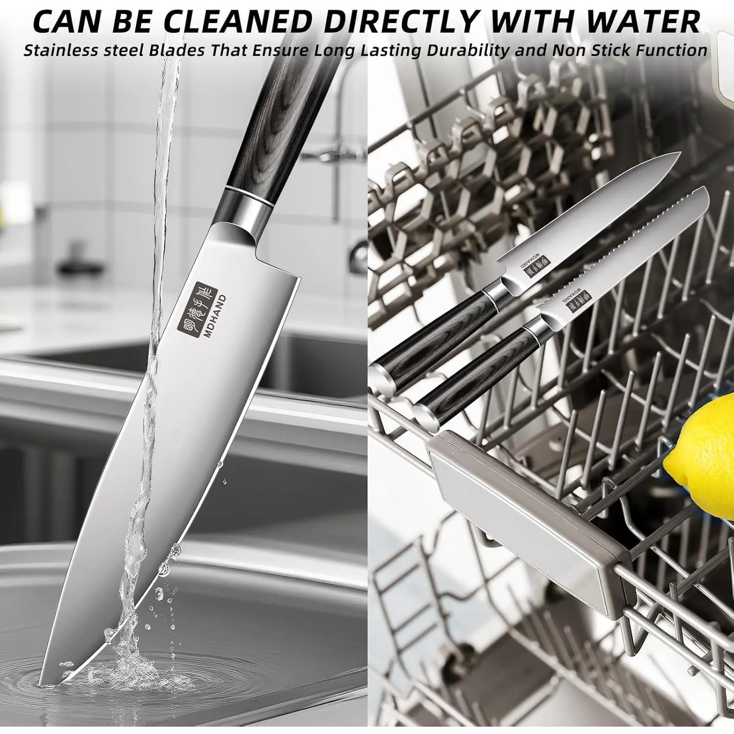 MDHAND Chef Knife Set with Roll Bag, 9PCS Professional Knife Sets with Sharpener, High Carbon Stainless Steel Japanese Kitchen Knives - Black Pakkawood Handle, Dishwasher Safe, For Cooking, Chef Gifts