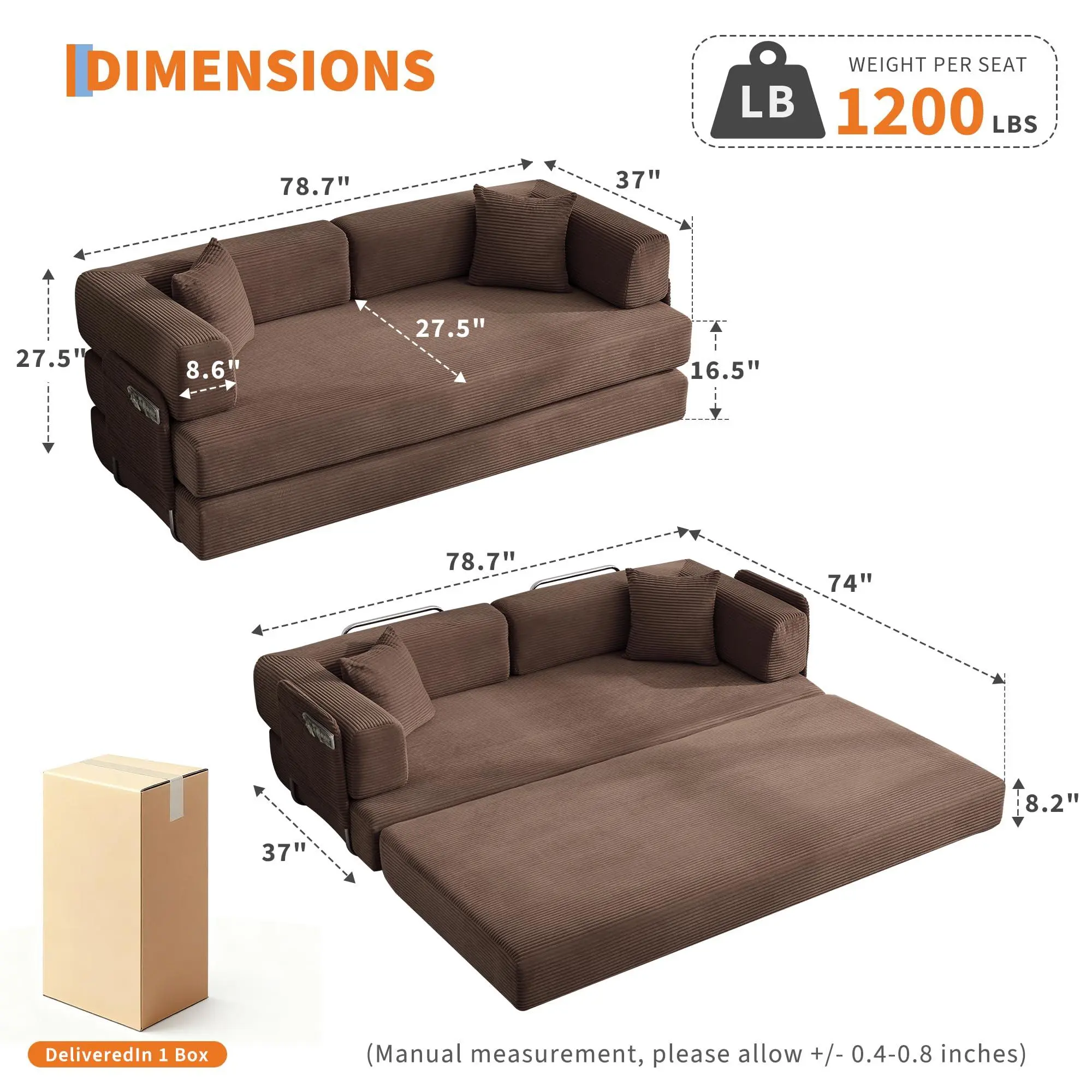 【Spacious Dimensions & Smart Space Solution】 Maximize your living area with generously sized proportions (78"L x 39"W). The expanded sleeping surface measures a full 78"L x 78"W, comfortably accommodating two adults. Perfect for small apartments, studios, or bonus rooms where space is premium.