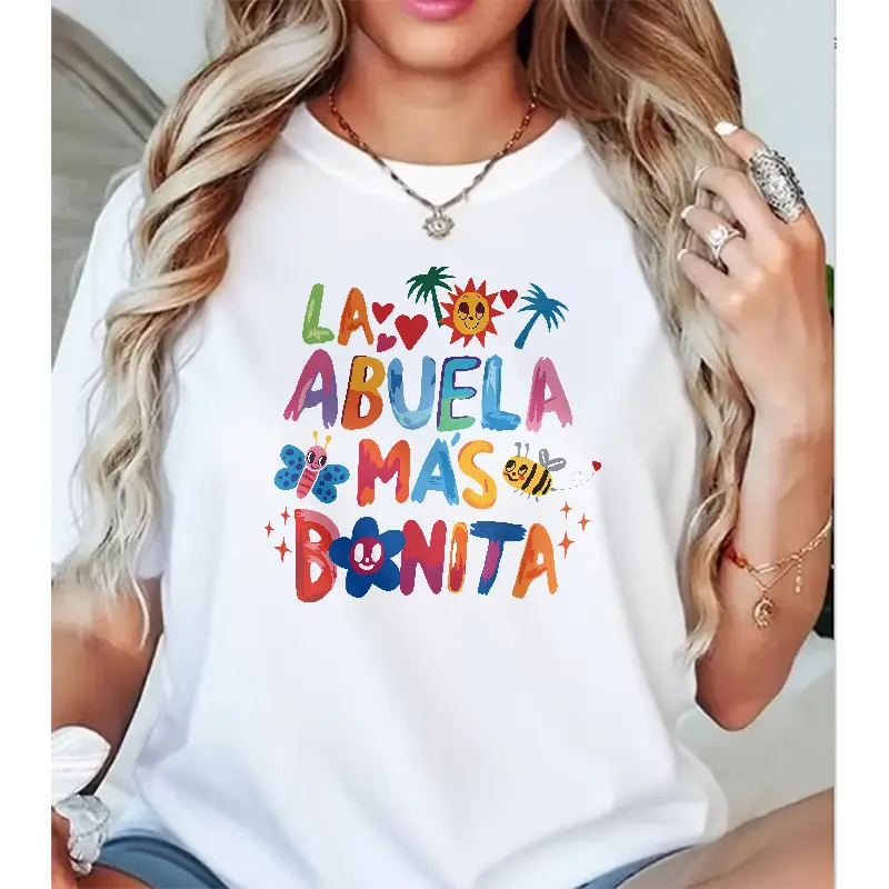 La Abuela Mas Bonita' Spanish Colorful Doodle Print T-shirt Latina Grandma Style Casual Top