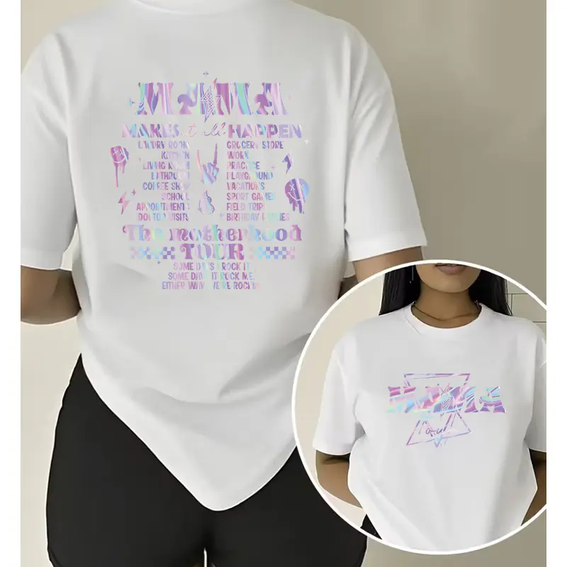 Mama The Motherhood Tour' Holographic Double-sided Print T-shirt Mom Empowerment Style Casual Top