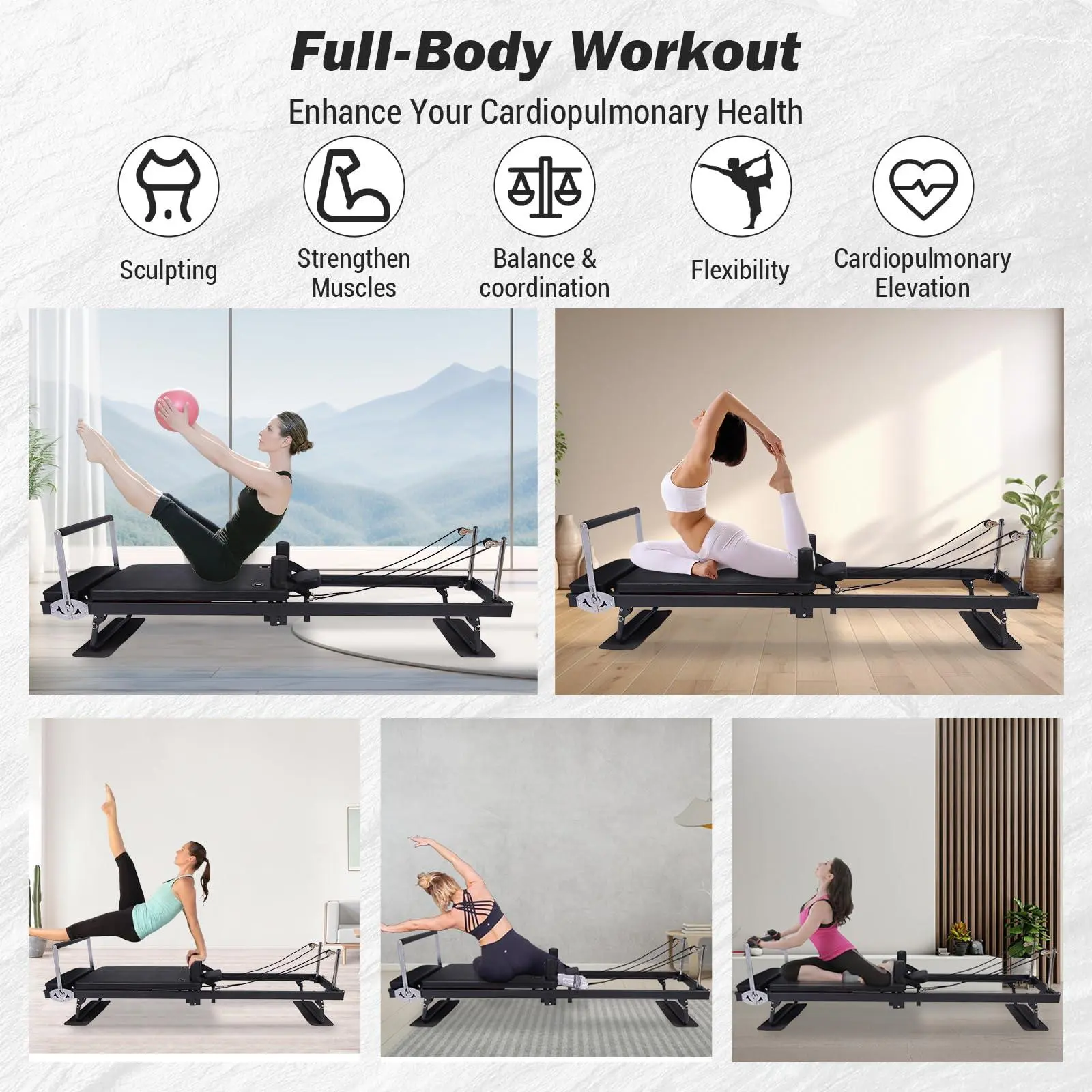Extra-long Frame for All Users: Experience full-body stretching with our 91.33 in extra-long aluminum alloy frame, supporting up to 330 LBS. Ideal for users from 4 ft 9 in to 6 ft 3 in, this pilates machine supports full body stretching and enhanced range of motion.This reformer is a space-saving option for home or studio Pilates practice and club classes.