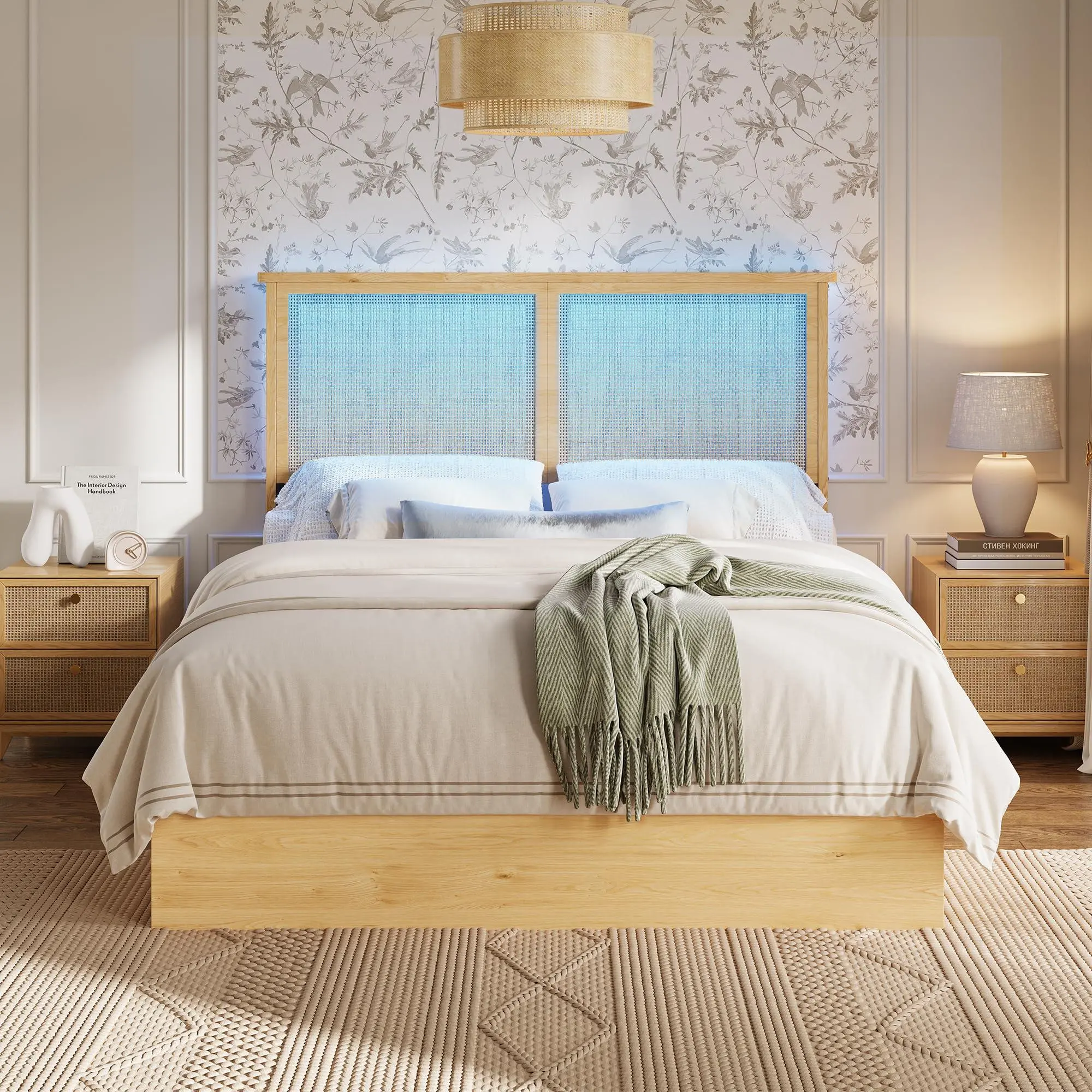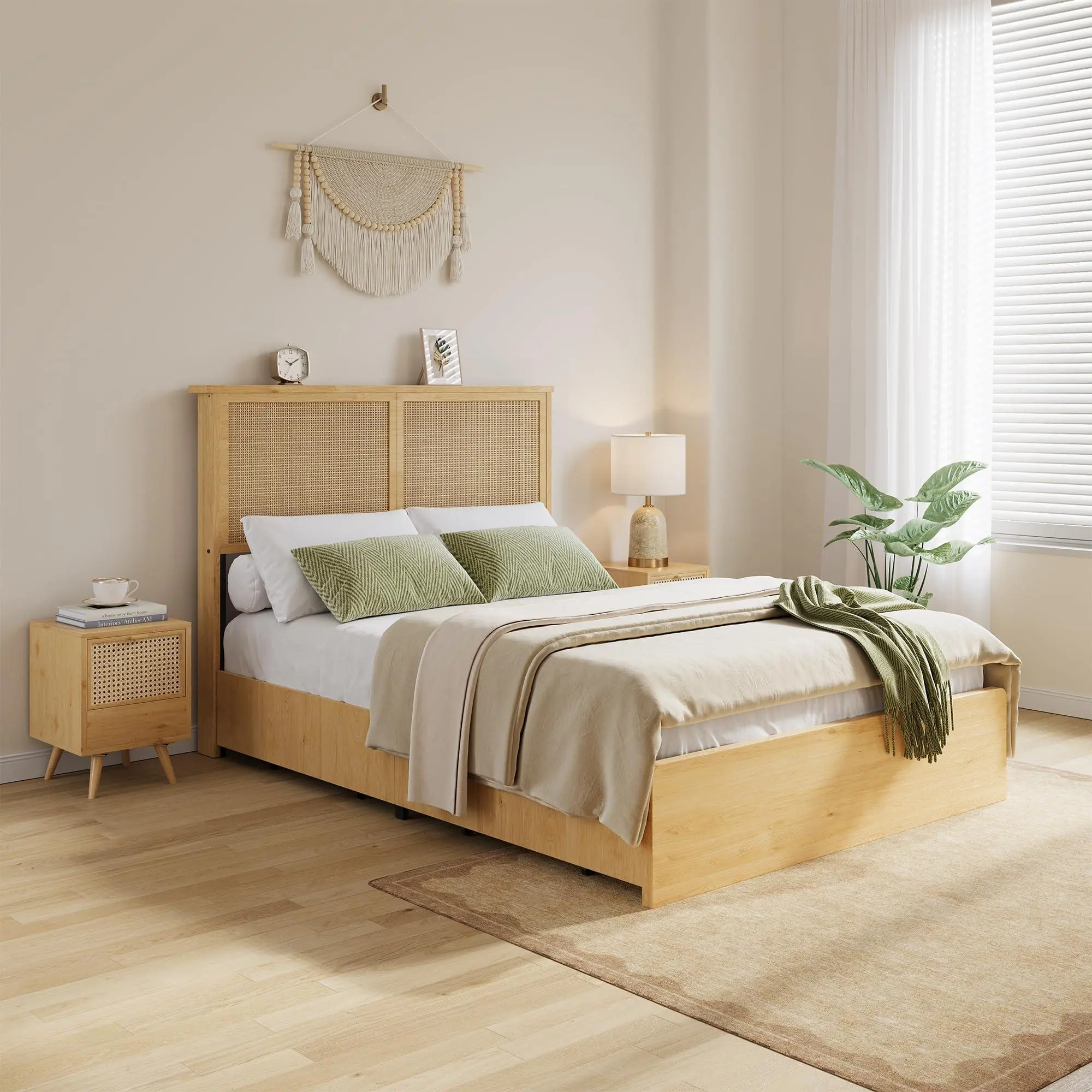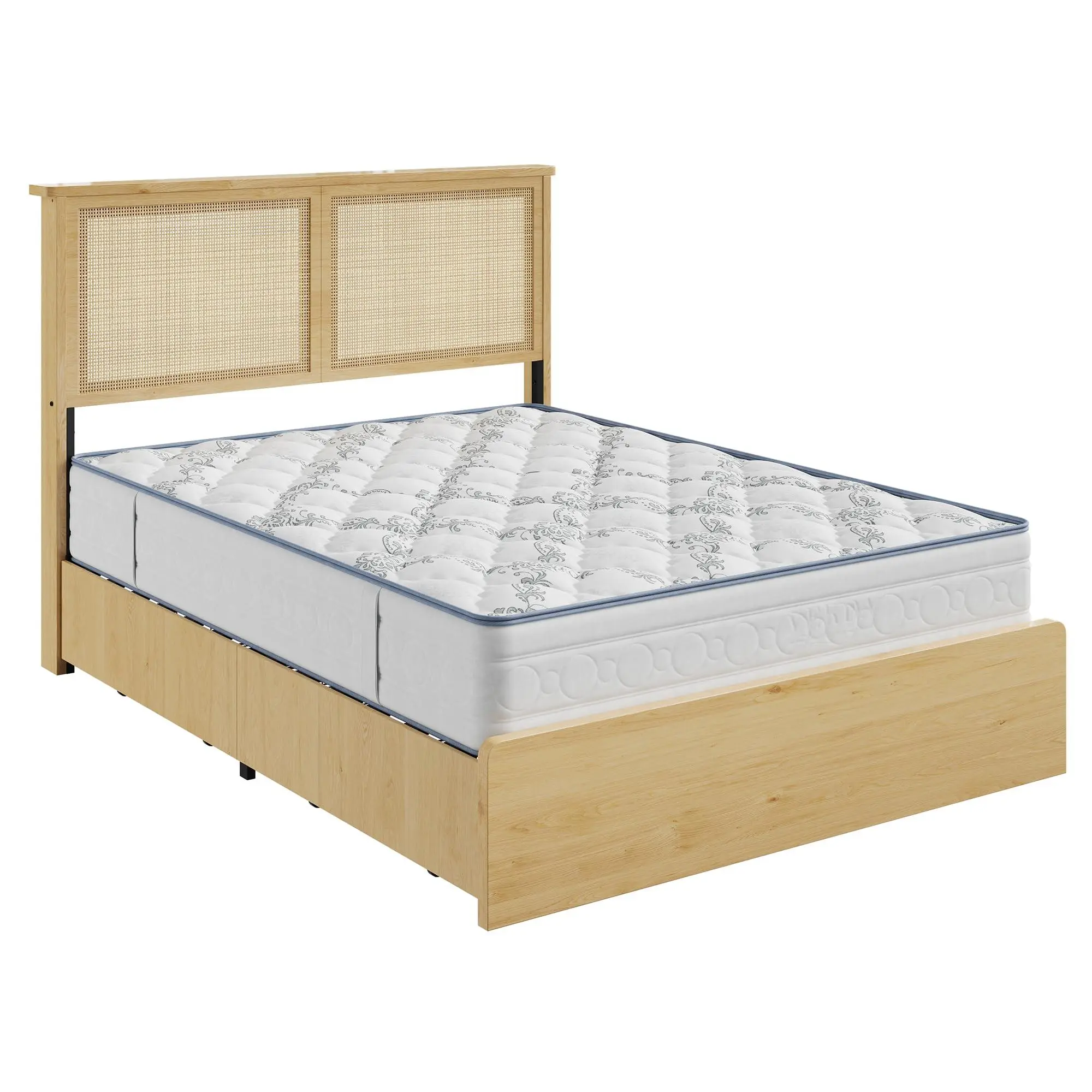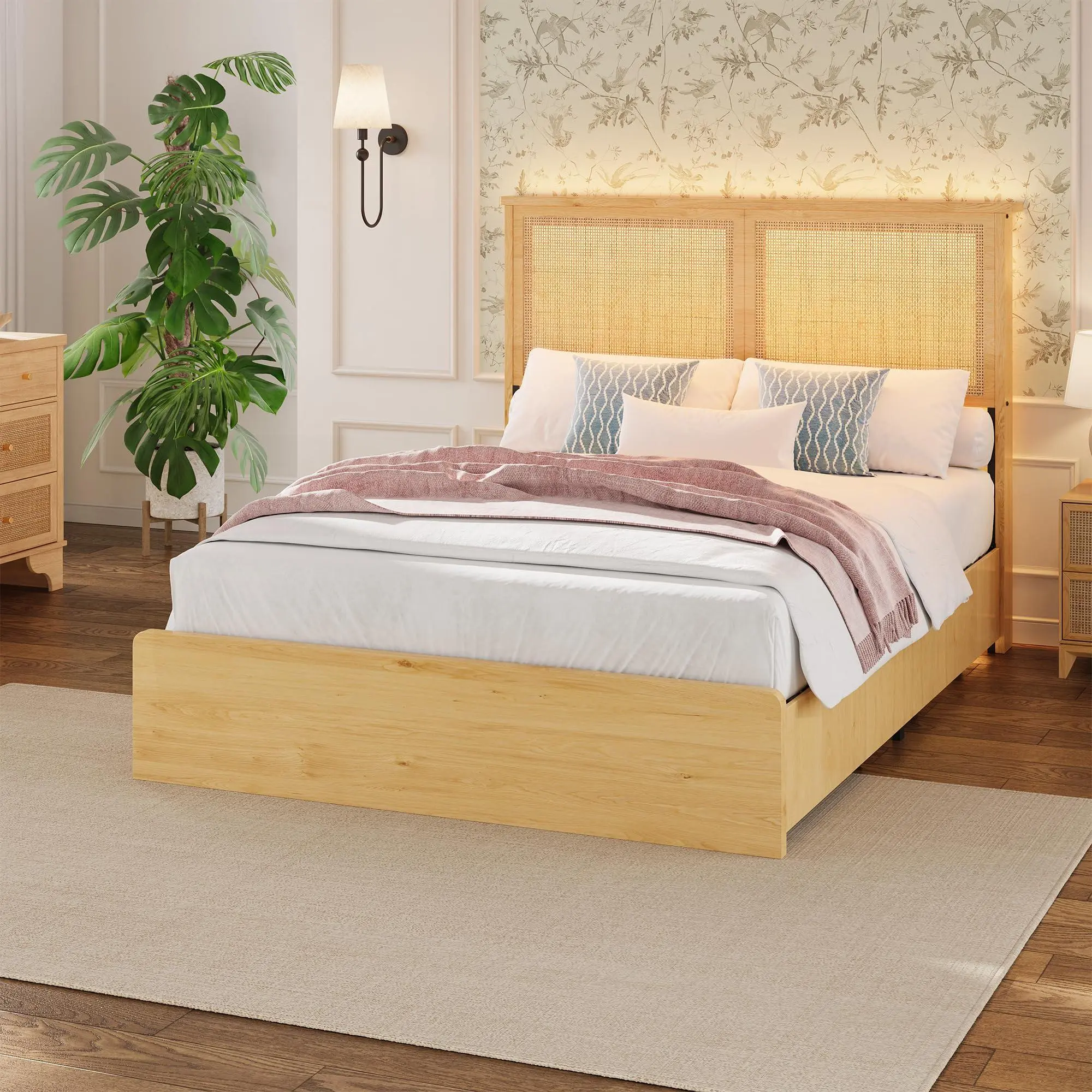Bohemian Rattan Headboard DesignThis full size bed frame features a natural rattan headboard with a light wood frame, bringing a warm, bohemian vibe to your bedroom. The woven rattan panels add texture and visual interest, blending seamlessly with coastal, boho, or minimalist decor styles.