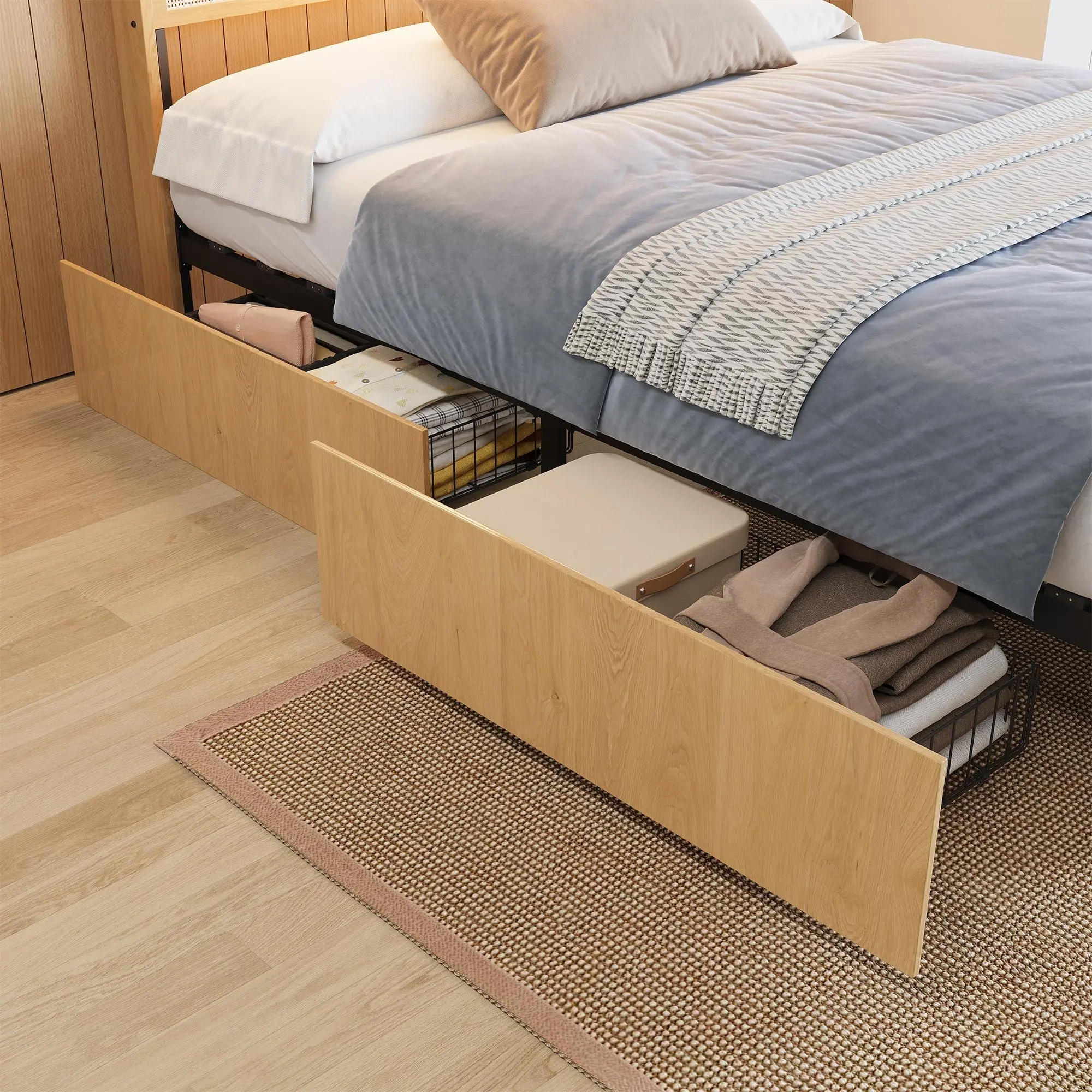 Ample Underbed Storage with 4 DrawersDesigned to maximize space, this platform bed comes with four large pull-out drawers (two on each side) under the bed, providing plenty of hidden storage for bedding, clothes, pillows, and other essentials, keeping your bedroom tidy and clutter-free.