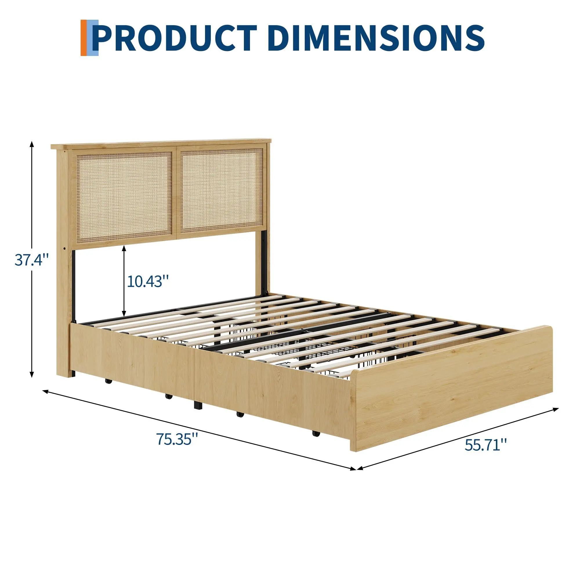 Versatile & Functional for Any BedroomWith dimensions of 75.35" L x 55.71" W x 37.4" H, this full size bed fits perfectly in most bedrooms. The natural wood finish and rattan headboard create a timeless look that complements any decor, making it a stylish and practical addition to your home.