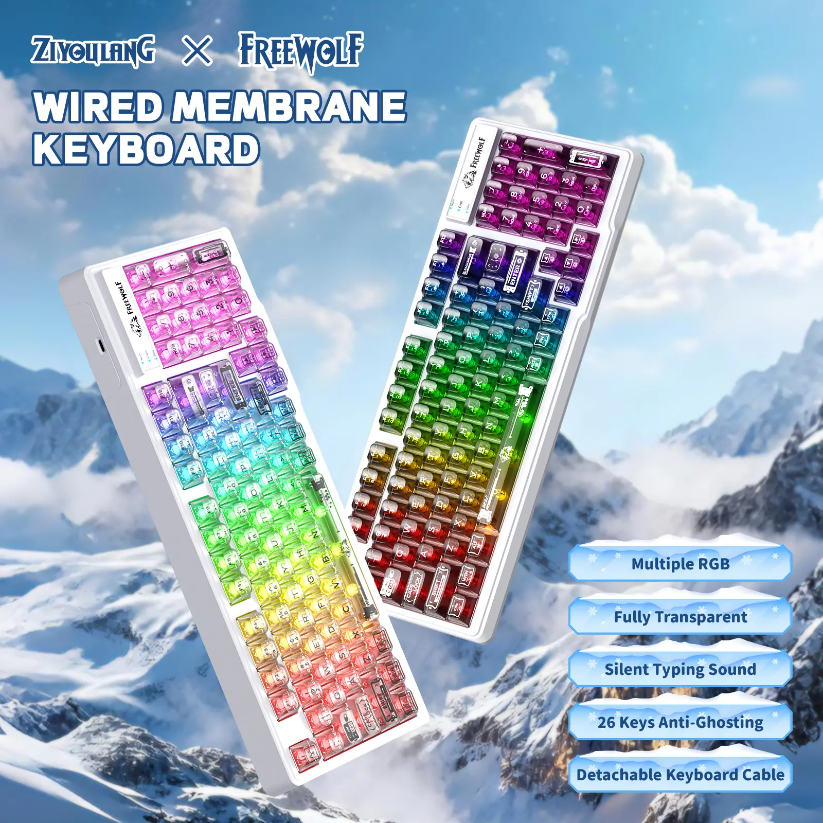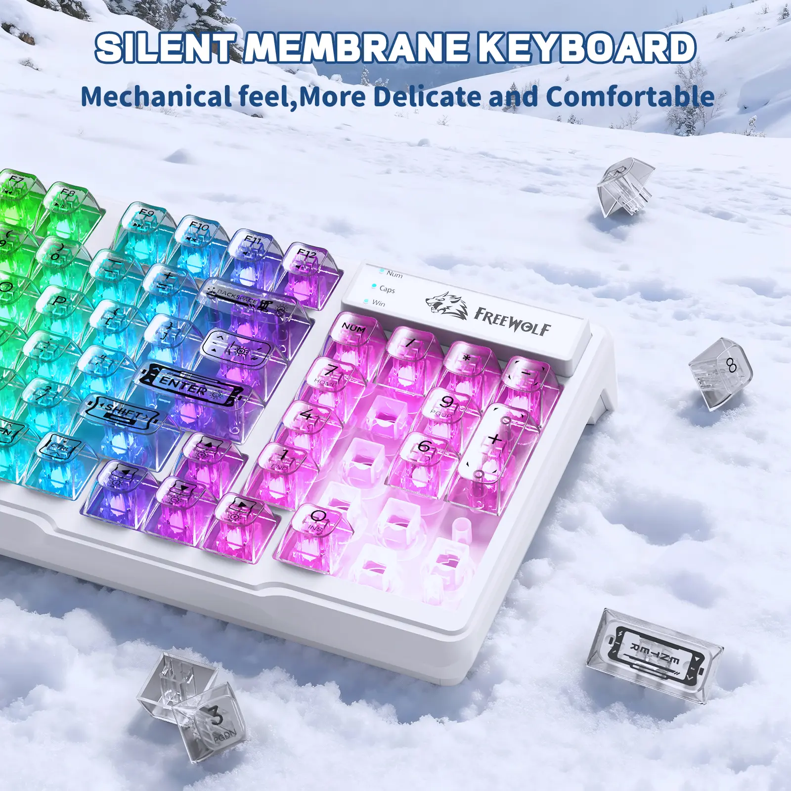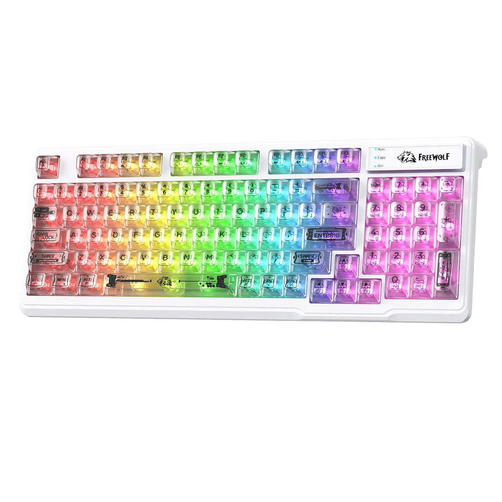 【Futuristic Transparent Keycaps with Industrial Aesthetic】FREEWOLF M95 redefines modern keyboard design with its transparent keycaps layered with bold industrial-style graphics. Each legend is UV printed for long-lasting clarity that resists fading and wear. The crystal-clear surface captures and reflects RGB light beautifully, creating a stylish and futuristic visual effect that fits perfectly in gaming or office setups.