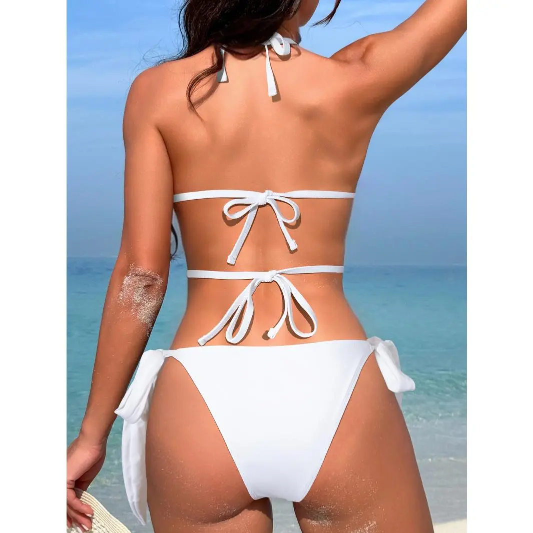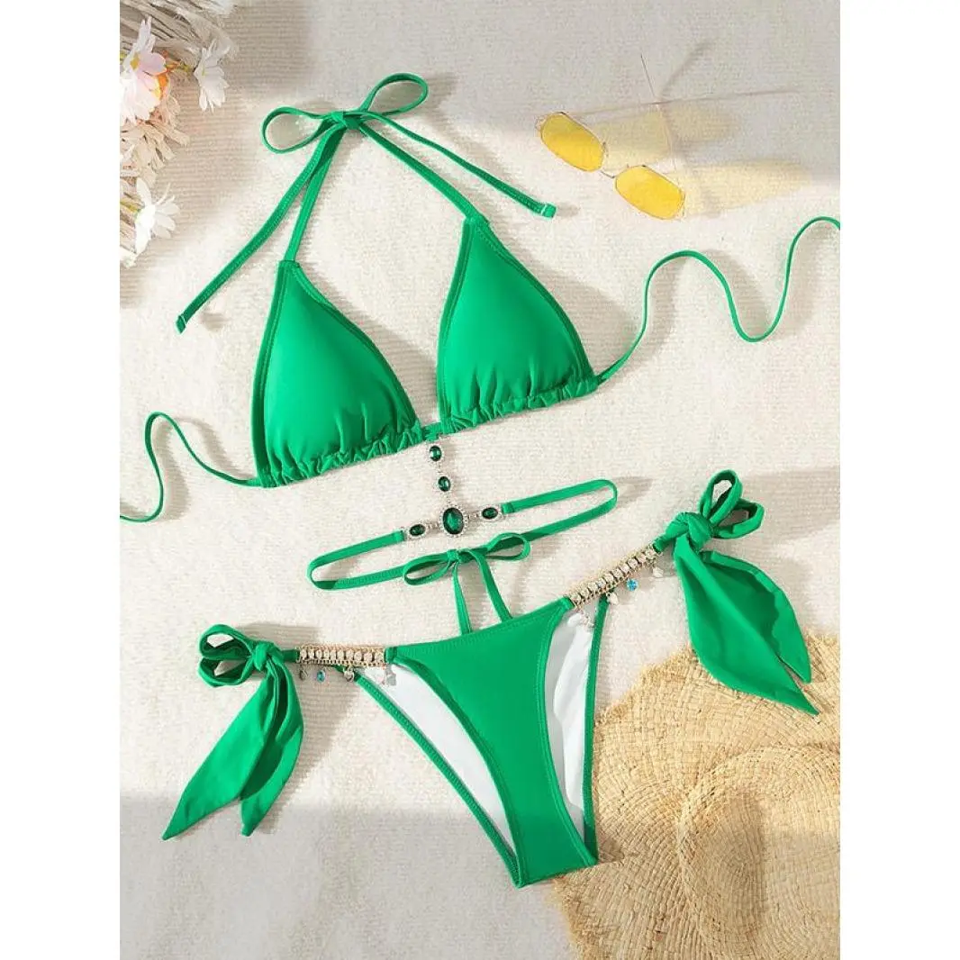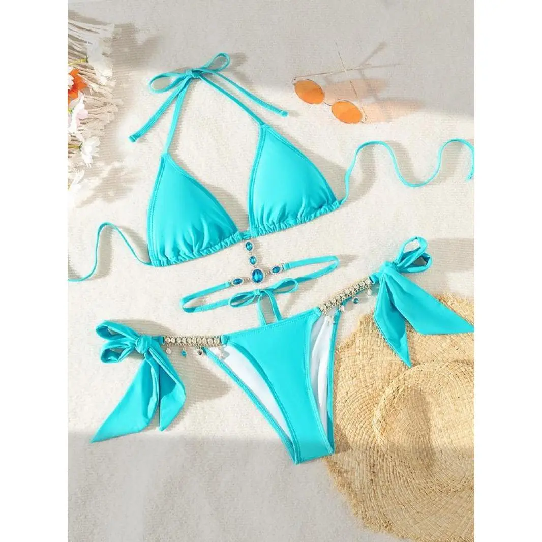 Elevate your summer style with this showstopping halter bikini set.Featuring a glamorous triangle cup top with tie-back closures and an eye-catching ring-linked detail connecting the top and bottoms.Adorned with sparkling rhinestone embellishments and cute bow accents, this set delivers the perfect blend of sexy allure and elegant charm, making you the ultimate star at any beach or pool party.