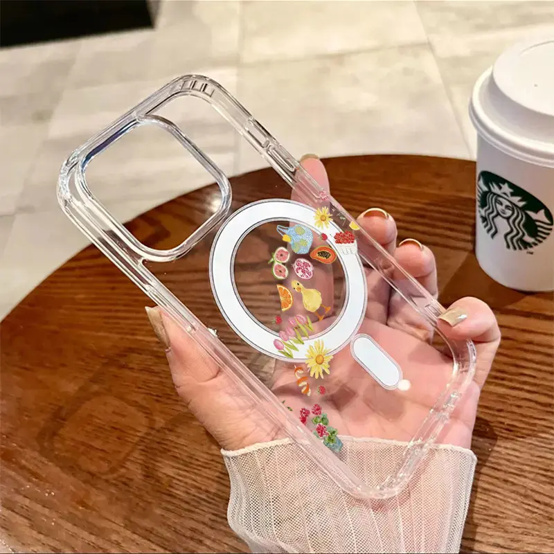 Adorable Duck Surrounded By Colorful Fruits Phone Case Featuring A Soft Tpu Back With Built-In Strong Magnet Ring, Blending Smooth Macaron Texture With Secure Magsafe Compatibility For iPhone 17 16 15 14 13 12 11 X XS