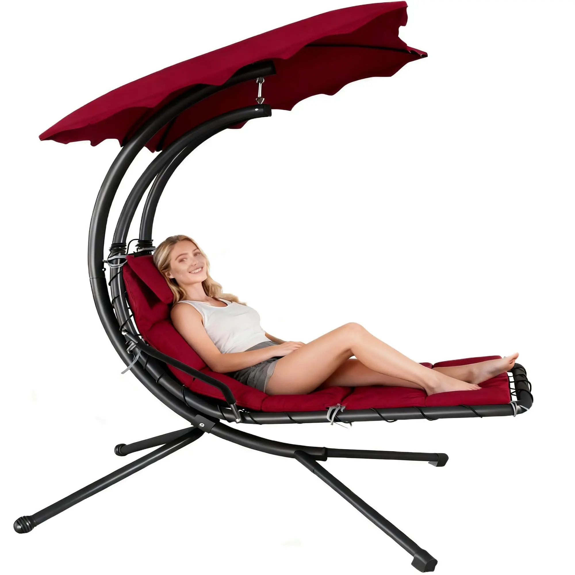 Enhanced Comfort: This swinging chaise chair features an ergonomic build that aligns perfectly with your back’s natural curve, offering exceptional lumbar support and easing strain. What’s more, the hammock chair’s X-shaped base legs guarantee steadiness, and the integrated pillow provides ample neck cushioning