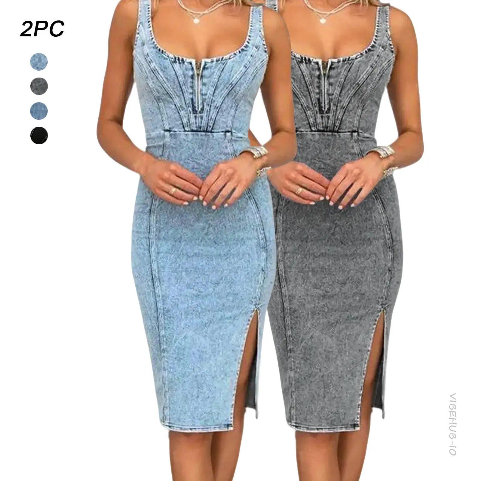 2PC Denim Dress for Women Sleeveless Side Slit Bodycon Midi Jean Dresses for Women Y2K Denim Corset Midi Dress | Sleeveless Slit Bodycon Dress for Party, Club & Daily Wear